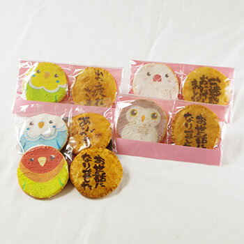 商品詳細名称福々ことり煎餅「ことりせんと言葉を選べる2枚台紙袋」内容量2枚入りサイズおせんべい1枚の大きさ 縦横8cm程・ 外袋の大きさ 12.5cm×21cm 約原材料名うるち米(国内産)、砂糖、卵白、醤油(小麦、大豆含む)、発酵調味料、澱粉、梅ペースト、塩、増粘剤(プルテン)調味料(アミノ酸等)、着色料(青1、黄4、赤102、赤106、フラボノイド色素)賞味期限2〜3ヶ月(季節により変わります)保存方法直射日光・高温多湿を避け保存して下さい。アレルギー卵 / 小麦 / 大豆 / 小麦・大豆・卵白(同じ作業場にて卵・小麦・落花生の取り扱いがございます)販売者有限会社 みなとや(東京都江東区門前仲町2-4-9)福々ことり煎餅「ことりせんと言葉を選べる2枚台紙袋」コトリ好きさんへのプレゼントに最適!かわいいコトリさんのお煎餅が気持ちを伝えるお手伝いをします。 可愛らしい小鳥をモチーフにしたお煎餅です。東京の老舗せんべい店「みなとや」が昔ながらの製法で作り上げる伝統の味わいと「カワイイ」がコラボしたことり好きの為のプチギフトです。ただのコトリのお煎餅ではなく可愛らしい笑顔のことりさんの絵柄がプリントされております。そのかわいらしいことりちゃんのお煎餅と気持ちが伝わるメッセージ煎餅を2枚ラッピングしますので伝えたい気持ちをカワイイワンちゃんがお伝えするので伝わること間違いなし!! まずは左側のことりさんの絵柄をお選びください。(買い物かごにてご用命ください) 次は右側のメッセージををお選びください。(買い物かごにてご用命ください) この二点でピンク色の台紙ラッピング袋にお入れして気持ち伝わるカワイイことりさんメッセージ煎餅を承ることができます!!
