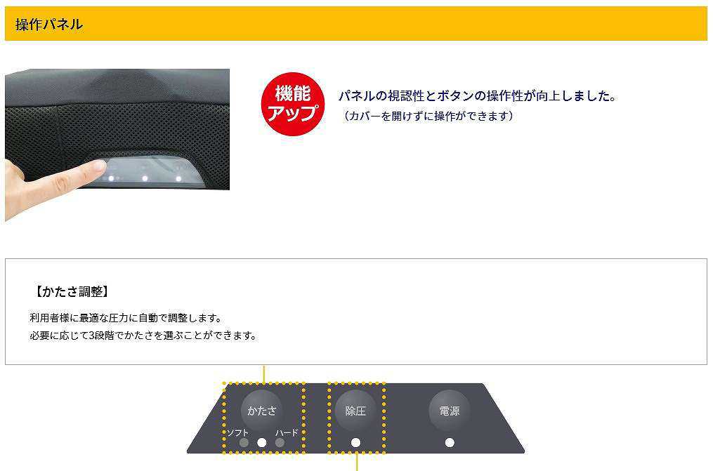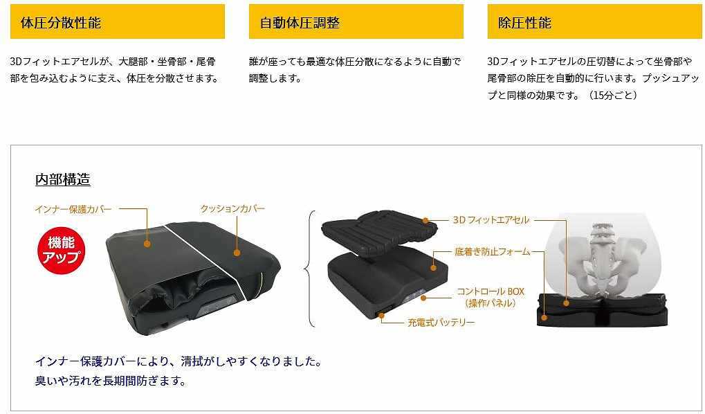 個別の車いすにフィットするクッション 「体圧調整」と「除圧」を自動で行うことで、 長時間座位時のおしりの痛みや床ずれの不安を 軽減する車いす用クッション サイズ:幅36cm×長さ40cm 幅38cm×長さ38cm・40cm、 厚さ8cm(最厚部12cm) 重量: 1.2kg ※バッテリー含まず 色:グレー