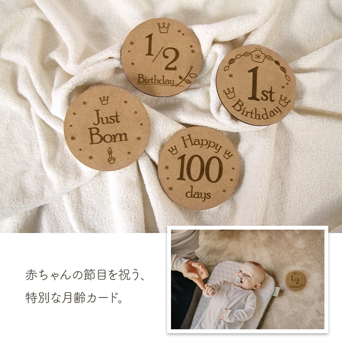 セット内容 月齢プレート×14 スタンド×1 化粧箱 名入れにつきまして ※こちらの商品は名入れサービスの対象外商品となります。 商品サイズ 月齢プレート:約9cm(直径) のし・ラッピング オリジナルギフトラッピングでお届けいたします。包装紙の対象外となります。おのし、ラッピング共に無料サービスです。弊店オリジナル熨斗をお付けいたします。 重要事項 お客様からのご注文に応じてオーダーメイドでご用意する関係上、注文内容のご変更やキャンセルにつきましては、弊店からの受注確認メールの送信をもって締切とさせていただきます。それ以降のご変更やキャンセルは一切お受けできません。あらかじめご了承の上、ご注文くださいませ。 手提げ用紙袋 直接お渡し用の紙袋を有料にてご用意しております。 ご希望の商品とは別に必要枚数分の数量をご購入ください。 ※商品サイズが紙袋の大きさを超える場合は、申し訳ございませんが紙袋をお付けすることができません。 手提げ用紙袋はコチラ カード 命名カード、メッセージカード(ギフトカード)、ウェディングカードを無料でご用意いたします。 ご使用用途例 出産祝い 誕生祝い 出産記念 誕生日プレゼント ハーフバースデー 1歳のプレゼント 百日祝い 初節句 節句祝い 1か月 2か月 3か月 6か月 ベビーシャワー 月齢プレート マイルストーンカード メモリアルプレート お昼寝アート フォトプロップス お支払い方法につきまして コンビニ決済、銀行振込でのお支払いの場合はご入金確認からの手配となりますので、通常納期以上にお時間を頂戴する場合がございます。 お急ぎのお客様はクレジットカード決済、代金引換をお選び下さい。 なお、お支払い総額が12000円を超える場合は代金引換はお受けできませんので、あらかじめご了承くださいませ。出産祝いにオススメ♪赤ちゃんの成長記録や記念フォトに!生まれたばかりの赤ちゃんは、本当に驚くほど速いスピードで大きくなります。そんな赤ちゃんの成長の記録を残しておく記念フォトに使える月齢プレート。誕生から1才までの大切なイベントの記念写真をナチュラルテイストのプレートがお手伝いします。生後すぐの記念写真は勿論、1か月、2か月、3か月、さらに100日祝いや6カ月目のハーフバースデー。1歳のお誕生日まで素敵な写真を彩る小道具としてお使いいただけます。セットにはディスプレイに便利なスタンド付きです。化粧箱に入ったセットですので、出産祝いの贈り物にも最適。喜びの記念品をずっと残しておけます。ベビーの成長記録として、大切な一瞬を切り取って思い出作りにお役立てください。ご用途: 出産祝い 出産 誕生日 お誕生日 100日祝い バースデー ハーフバースデー 記念 記念日 御祝い お祝い 御祝 お祝 ベビー ギフト プレゼント メモリアル 名入れ 名入り 名前入り 女の子 男の子 オーガニックコットン 出産記念