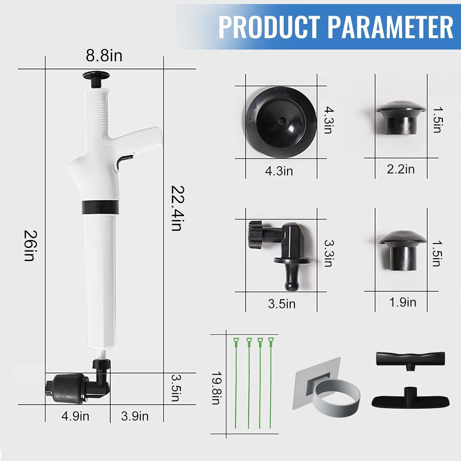 【高圧設計】高圧に強く、長寿命設計です。他の従来の手動トイレプランジャーよりも効果的です。 【可視ゲージ】さまざまなニーズに合わせて簡単かつ迅速に圧力を追加できる可視ゲージの設計。 【より簡単な操作】ガスバッグを押して、詰まった排水管にプランジャーを挿入し、エアボタンを押して詰まりを解消します。 【ワンタッチでつまりを解消】本体と空気入れを接続し、次は対応な先端ゴムを選び、それから空気入れで適当な圧力を加圧し、ワンタッチつまりを解消します!トイレ、浴室、洗面台の詰まりの除去に、強力な気圧ですばやく詰まりを解消します。詰まり水に触れずクリーンな作業が可能。