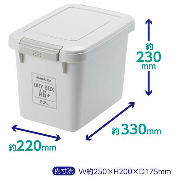 カメラやレンズなどの精密機器やキャンプ用品など湿気に弱いものの収納に便利な抗菌仕様のドライボックス 【ボックスの表面で菌が増殖するのを銀イオンで抑制する、抗菌加工のドライボックス。シンプルなデザインと落ち着きのあるボディーカラー(ウォームグレー)。】 内寸法 約W250×H200×D175mm 外寸法 約W330×H230×D220mm 重量 約850g 容量 9.5L 材質 (本体)ポリプロピレン、ABS樹脂 (パッキン)シリコーンゴム (乾燥剤ケース)ポリプロピレン キャスター 無し 付属品 乾燥剤 キングドライ(15g×2入)