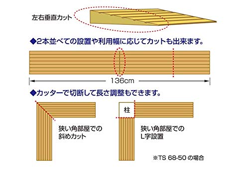 ◆商品名:シンエイテクノ 段差解消スロープ タッチスロープ68 TS68-20 幅68cm/段差2.0cm用・角部屋や廊下・勝手口など狭い出入口に最適なスロープです。・柔軟性の高いスロープで狭い場所向き。・廊下の突き当たりでも加工せずに使用できます。・裏面の両面テープで簡単に固定できます。