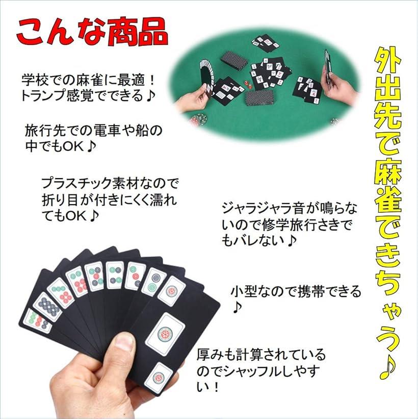 ・麻雀牌がトランプに。旅行先では荷物になるので出来なかった麻雀がどこでも雀荘に。プラスチック素材で水にも強く、丈夫なのでジュースをこぼしても大丈夫。・「こんな商品」学校での麻雀に最適。トランプ感覚でできる*旅行先での電車や船の中でもOK*プラスチック素材なので折り目が付きにくく濡れてもOK*ジャラジャラ音が鳴らないので修学旅行さきでもバレない*小型なので携帯できる*厚みも計算されているのでシャッフルしやすい。・「活躍場所」携帯できるのでカバンに入れておくことが出来る。値段も手ごろで学校での昼休み、修学旅行、社員旅行に特に人気があります*・「商品詳細」サイズ:約9.5x5.2cm 重さ 360g 枚数144枚(筒子36枚 萬子36枚 索子36枚 字牌28枚 花牌8枚)サイコロ 2個、(カラーはロット生産の為変更があります)収納袋付き・「商品材質」 プラスチック( 防水 折り曲がりにくい仕様)※ 他ネットショップでも併売しているため、ご注文後に在庫切れとなる場合があります。予めご了承ください。※ 品薄または希少等の理由により、参考価格よりも高い価格で販売されている場合があります。ご注文の際には必ず販売価格をご確認ください。※ 沖縄県、離島または一部地域の場合、別途送料の負担をお願いする場合があります。予めご了承ください。※ お使いのモニタにより写真の色が実際の商品の色と異なる場合や、イメージに差異が生じることがあります。予めご了承ください。※ 商品の詳細(カラー・数量・サイズ 等)については、ページ内の商品説明をご確認のうえ、ご注文ください。※ モバイル版・スマホ版ページでは、お使いの端末によっては一部の情報が表示されないことがあります。すべての記載情報をご確認するには、PC版ページをご覧ください。麻雀カード牌携帯カードゲームマージャンカード静音旅行軽量持ち運びポータブル卓上ゲーム