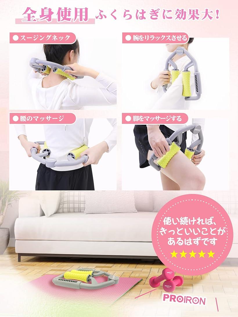 「使いやすいオールインワンフルマッサージ」是非お試しください。手で持って、太もも、ふくらはぎの両面を同時にマッサージすることができ、時間を節約し、仕事を終えた後に素早くマッサージとリラクゼーションを実現します。一体型マッサージローラーは、全方向の脚をマッサージすることができます。2輪の構造より使いやすく、是非お試しください。「素材はシリコンを使用し、優しく、安全です」本製品のマッサージ部分はシリコン製で、より優しく快適なため、敏感肌の方でも安心して使用できます。「コントロールが可能」PROIRON独自の改良型構造は、上部にスプリングを使用しているので、他の構造のようにきつすぎたり、ゆるすぎたりする欠点を避け、最大脚周りは75cmまで自由に使用できます。「洗浄が簡単」お手入れはとても簡単で、汚れたらきれいな水で洗い流すだけで、新品のようにきれいになります。「セット内容」本体x1、日本語説明書x1。※ 他ネットショップでも併売しているため、ご注文後に在庫切れとなる場合があります。予めご了承ください。※ 品薄または希少等の理由により、参考価格よりも高い価格で販売されている場合があります。ご注文の際には必ず販売価格をご確認ください。※ 沖縄県、離島または一部地域の場合、別途送料の負担をお願いする場合があります。予めご了承ください。※ お使いのモニタにより写真の色が実際の商品の色と異なる場合や、イメージに差異が生じることがあります。予めご了承ください。※ 商品の詳細(カラー・数量・サイズ 等)については、ページ内の商品説明をご確認のうえ、ご注文ください。※ モバイル版・スマホ版ページでは、お使いの端末によっては一部の情報が表示されないことがあります。すべての記載情報をご確認するには、PC版ページをご覧ください。