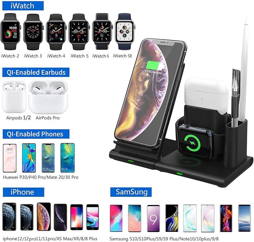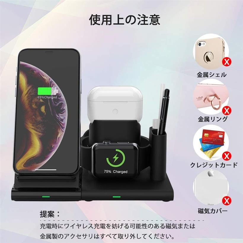 ・「素晴らしい互換性」対応機種:* iPhone 13 /13pro/13 Mini /iPhone 12 Pro Max/12 Pro/12/SE2/iPhone 11/pro/pro max/iPhone 8/8Plus/iPhone X/XS/XR/X Max*Galaxy S20/S10/S10 Plus/S9/S9 Plus/Note8/S8/S8 Plus/S7/S7 Edge/S6 Edge Plus*Qi対応するスマホ機種。iwatchとイヤホンを充電するには、対応する充電器と充電ケーブルを準備してから、充電器に組み立てる必要があります。・「4in1多機能充電スタンド」携帯電話、watch、イヤホン用の一般的な充電スタンドに加えて、ApplePen用の新しい充電スタンドも追加されました。これにより、充電と保管に使用できるApplePenの充電が必要な人にとってより便利になります。複雑な充電ケーブルがないので、テーブルがすっきりと整頓されています。・「分解可能デザイン」 本体は携帯電話の充電用とWatchやイヤホンの充電用の2つに分けられます。ヘッドセットやWatchを充電しているときは、携帯電話の充電器をスタンドとして使用できるので、映画鑑賞にとても便利です。シーンに合わせて、縦置き・横置き、両方向の充電にも対応します。また、Watchの充電ケーブルを外すことができるので、出張・旅行でも活躍します。・「先端の充電スピード」充電効率を高め、iPhoneへは従来のワイヤレス充電器に比べ、充電スピードが約10%高速化した7.5W出力充電が可能です。また、Galaxyへ10W出力によるフルスピード充電を実現しました (注:安定した高速充電のため、充電時には9V-2AQC3.0アダプターを使用してください。)。・「安定な保護性」色んな保護機能が搭載し、過電流、過充電、過電圧、過熱などそして温度制御機能、自動充電停止、異物、金属物識別等機能も備えて、金属物を置いて呼吸ライトすぐに点滅し、スマホの安全を確保します。「*ご注意:充電の時、ケースの厚すぎが原因で、充電できない場合があります。ケースの厚さは6mm以下のものに最適です。」※ 他ネットショップでも併売しているため、ご注文後に在庫切れとなる場合があります。予めご了承ください。※ 品薄または希少等の理由により、参考価格よりも高い価格で販売されている場合があります。ご注文の際には必ず販売価格をご確認ください。※ 沖縄県、離島または一部地域の場合、別途送料の負担をお願いする場合があります。予めご了承ください。※ お使いのモニタにより写真の色が実際の商品の色と異なる場合や、イメージに差異が生じることがあります。予めご了承ください。※ 商品の詳細(カラー・数量・サイズ 等)については、ページ内の商品説明をご確認のうえ、ご注文ください。※ モバイル版・スマホ版ページでは、お使いの端末によっては一部の情報が表示されないことがあります。すべての記載情報をご確認するには、PC版ページをご覧ください。「多機能・分解可能」本体は携帯電話の充電用とIpencil(第1世代)、Watchやイヤホンの充電用の2つに分けられます。ヘッドセットやWatchを充電しているときは、携帯電話の充電器をスタンドとして使用できるので、映画鑑賞にとても便利です。シーンに合わせて、縦置き・横置き、両方向の充電にも対応します。また、時計の充電ケーブルを外すことができるので、出張・旅行でも活躍します。「注意」iwatchとイヤホンを充電するには、対応する充電器と充電ケーブルを準備してから、充電器に組み立てる必要があります。「急速充電」三つのコイルが搭載されているため、通常のワイヤレス充電器より広い充電面積をカバーできます。10W、7.5W、5Wの3つの充電パターンがあり急速充電にも対応、高い互換性があるため、iPhoneやAndroid等幅広い機種に対応しています。*急速充電には「QuickCharge3.0」対応のUSB充電器が必要です。(QC3.0アダプターが含まれています.)「ご注意」充電の時、高速充電スピードと安定性のため、ぜひ18W/9V/2A規格のQC3.0高効率の充電アダプターを使ってください。充電の時、ケースは厚すぎの原因で、充電できない場合はあります。シェルの厚さが6mm未満である必要があることを確認してください。「スタンド機能」この製品を使用すると、垂直方向または水平方向に縛られることなく、充電中に長時間ビデオ通話を行うことができます。スマートフォンで受信したプッシュ通知も見つけやすく、すぐに電話に出ることができます。「充電インジケーター」マグネットで簡単に取り外して、二つの充電器になれ、大変お得です。充電状況が確認できる動作確認LEDインジゲーターが付属します。スマートフォンを縦に置いても横に置いても、「充電中」「充電完了」「充電エラー」などが一目でわかります。通電:青3秒点灯/待機:消灯/充電中:赤点灯/充電完了:青点灯/エラー時:赤青点滅「優れた保護機能&滑り防止」充電器は優れたABS材料を採用して、底部に散熱穴と滑り止めゴムがあるデザイン、快速放熱、滑り防止です。充電器は高品質なQiチップを使用して、製品は過電流、過充電、過電圧、過電力、過熱、短路保護およびデバイスマッチング保護があります。Qi認証取得済み「高品質素材」すっきり