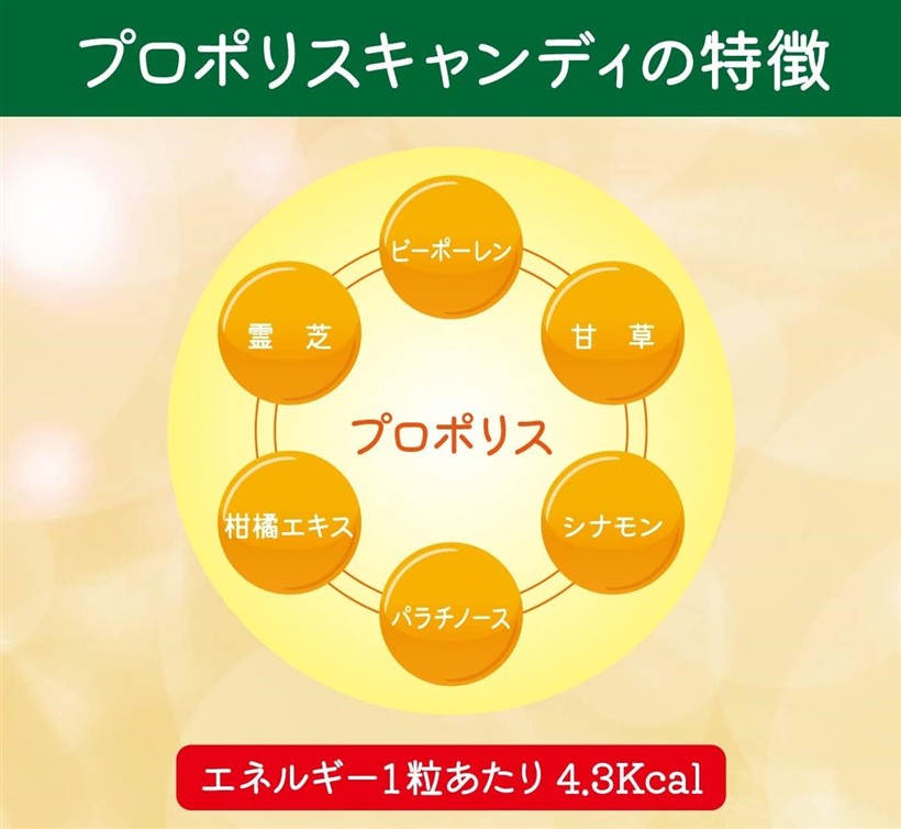 「高濃度プロポリス」高品質ブラジル産プロポリスを1粒に約80mg配合したプロポリスキャンディーです。1粒わずか4Kcalのノンシュガー低カロリー飴となっています「自慢のプロポリス配合」ブラジルで良いプロポリスが採れる地域にある自社養蜂場で獲れたはちみつプロポリスを使用しています「内容量」1袋あたり30包入り 「注意事項」 食品アレルギーのある方・ミツバチ産品にアレルギーのある方はご注意ください。※ 他ネットショップでも併売しているため、ご注文後に在庫切れとなる場合があります。予めご了承ください。※ 品薄または希少等の理由により、参考価格よりも高い価格で販売されている場合があります。ご注文の際には必ず販売価格をご確認ください。※ 沖縄県、離島または一部地域の場合、別途送料の負担をお願いする場合があります。予めご了承ください。※ お使いのモニタにより写真の色が実際の商品の色と異なる場合や、イメージに差異が生じることがあります。予めご了承ください。※ 商品の詳細(カラー・数量・サイズ 等)については、ページ内の商品説明をご確認のうえ、ご注文ください。※ モバイル版・スマホ版ページでは、お使いの端末によっては一部の情報が表示されないことがあります。すべての記載情報をご確認するには、PC版ページをご覧ください。名称:キャンディー原材料:還元パラチノース(ドイツ製造)、 プロポリスエキス、オレンジ濃縮果汁、桂皮エキス、甘草エキス、花粉エキス、生姜エキス、陳皮工キス、クコシエキス/酸味料、香料、甘味料(アセスルファムK、スクラロース)、着色料(ビタミンB2)内容量:66g(個包装を含む)賞味期限:パッケージに記載保存方法:直射日光、高温多湿を避けて保存して下さい。販売所:日本自然療法株式会社 プロポリス健康増進会東京都新宿区西新宿6-26-12製造者:加藤製菓株式会社愛知県あま市七宝町沖之島上折39番地栄養成分表示(1袋60gあたり):エネルギー 121kcal たんぱく質 0.1g 脂 質 0.1g 炭水化物 58.5g - 糖類 Og 食塩相当量 0.002g 1粒 (2.1g)あたり4.2kcal