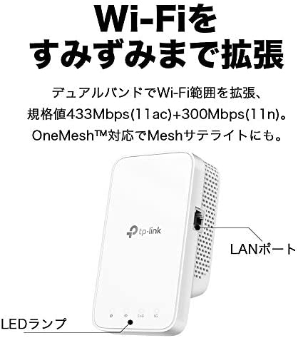 433Mbps (11ac) + 300Mbps (11n) のWi-Fi環境を構築[中継器の特徴] Wi-Fi範囲を中継して拡張。9年連続世界シェアNo.1による世界に認められた安定感[OneMesh対応] TP-Link OneMesh対応。同じくOneMesh対応ルーターと併用してメッシュWi-Fi環境を構築。[かんたんアプリ対応]スマホ用かんたん設定アプリ "Tether"(テザー)対応。誰でもかんたんに設定ができます[LEDで最適な設置場所を確認] 前面のスマートシグナルインジケータ(LEDランプ)によりひとめで最適な設置位置を判別できます<店内2点以上お買上げでさらに200円引クーポン進呈> TP-Link 無線LAN メッシュWiFi 中継器 433+300Mbps OneMesh対応 RE230433Mbps (11ac) + 300Mbps (11n) のWi-Fi環境を構築[中継器の特徴] Wi-Fi範囲を中継して拡張。9年連続世界シェアNo.1による世界に認められた安定感[OneMesh対応] TP-Link OneMesh対応。同じくOneMesh対応ルーターと併用してメッシュWi-Fi環境を構築。[かんたんアプリ対応]スマホ用かんたん設定アプリ "Tether"(テザー)対応。誰でもかんたんに設定ができます[LEDで最適な設置場所を確認] 前面のスマートシグナルインジケータ(LEDランプ)によりひとめで最適な設置位置を判別できます