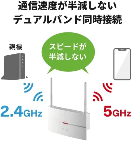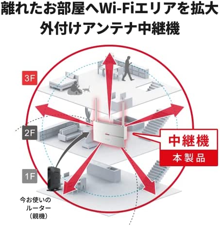 ●中継先に繋がる台数も楽しみ方ももっとたくさん! ●デュアルバンド対応、さらに同時接続にも対応 ●あなたのスマホを狙って高速Wi-Fiが届く準拠規格:11ac / 11n / 11a / 11g / 11b / ARIB STD-T71(5GHz帯小電力データ通信システム)/ ARIB STD-T66(2.4GHz帯小電力データ通信システム)、データ転送速度(理論値):最大866Mbps(11ac)、最大300Mbps(11n)、最大54Mbps(11a、11g)、最大11Mbps(11b)有線LANインターフェース規格:IEEE802.3ab(1000BASE-T)、IEEE802.3u(100BASE-TX)、IEEE802.3(10BASE-T)、端子数:1(AUTO-MDIX対応)、データ転送速度:1000/100/10Mbps×1(自動認識)、端子形状:RJ-45電源:AC100V 50/60Hz、最大消費電力:7.9W(最大)外形寸法(幅×高さ×奥行):160×80×28mm※本体のみ(突起部除く)、質量:約240g動作保証環境 結露なきこと:温度 0〜40℃、湿度 10〜85%、保証期間:1年間、VCCI適合:VCCI Class B、主な付属品:スタンド / AC延長コード(2m) /<店内2点以上お買上げでさらに200円引クーポン進呈> バッファロー WiFi 無線LAN 中継機 Wi-Fi 5 11ac 866 + 300Mbps 送料無料 ●中継先に繋がる台数も楽しみ方ももっとたくさん! ●デュアルバンド対応、さらに同時接続にも対応 ●あなたのスマホを狙って高速Wi-Fiが届く準拠規格:11ac / 11n / 11a / 11g / 11b / ARIB STD-T71(5GHz帯小電力データ通信システム)/ ARIB STD-T66(2.4GHz帯小電力データ通信システム)、データ転送速度(理論値):最大866Mbps(11ac)、最大300Mbps(11n)、最大54Mbps(11a、11g)、最大11Mbps(11b)有線LANインターフェース規格:IEEE802.3ab(1000BASE-T)、IEEE802.3u(100BASE-TX)、IEEE802.3(10BASE-T)、端子数:1(AUTO-MDIX対応)、データ転送速度:1000/100/10Mbps×1(自動認識)、端子形状:RJ-45電源:AC100V 50/60Hz、最大消費電力:7.9W(最大)外形寸法(幅×高さ×奥行):160×80×28mm※本体のみ(突起部除く)、質量:約240g動作保証環境 結露なきこと:温度 0〜40℃、湿度 10〜85%、保証期間:1年間、VCCI適合:VCCI Class B、主な付属品:スタンド / AC延長コード(2m) /