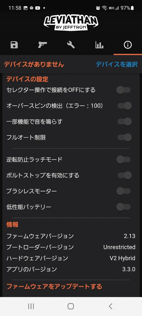 【安全性の注意点】●製品説明書をよく読んで取扱下さい。●エアガン・電動ガン・ガスガンは周囲の状況を確かめながら人や車が通らない場所で遊びましょう。●エアガンの形をしているものを持ち運ぶ場合は、周囲に誤解や恐怖を与えないようケースやバッグをお使い下さい。●サバゲー会場以外では、小さい子供やマナーの知らない人に触らせないようにしましょう。●エアガンから放たれたBB弾は跳ね返りますので必ずエアガン・電動ガン・ガスガンで遊ぶ場合はゴーグルを着用しましょう。●人や動物にエアガン・電動ガンを向けたり発射してはいけません。●絶対にエアガン・電動ガンの銃口を覗いてはいけません。Jefftron製 Leviathan-V2 OPTICAL 後方配線 ジェフトロン リヴァイアサン Jeetronの電子トリガーリヴァイアサンのVer.2後方配線用。 スタンダードVer.2ギアボックスのスイッチと置き換えて使用するドロップイン型のETU(Electronic Trigger Unit)。 組み込み後、アプリを利用してセレクターのファイヤコントロール、サイクルコントロール、プリコック、アクティブブレーキ等を簡単に設定できる。 アプリが非常に良くできており、視覚的に設定レベルが分かりやすく設定変更後銃への反映も極めて速い。 設定変更後1秒で銃の動きが変わるのは中々感動する光景だ。 設定をプリセットとして保存することができ、7.4v用、11.1v用など様々自分用の設定を保存しワンタップで呼び出すことができる。 発射弾数、消費電力など様々なステータスをアプリ上で確認も可能。 説明書やアプリが日本語に完全対応しているのも嬉しいところだ。 当店で組み込みを行う場合、組み込み工賃は+5,000円(税別)となります。ご希望の際にはご要望欄にてご指示ください。お持ち込みでの組み込みの場合には別途工賃がかかることがございますので予めご了承ください。 旧型と比べ、セクターギアとセレクタープレート検知スイッチが光センサーになり、組み込み使用時の破損や摩耗がなくなり組み込みやすくなりました。 トリガーはNGRSと同じ極小ストローク(0.13mm)のタクトスイッチになり物理スイッチでショートストロークが可能となっています。 もちろんRFTS(Real Feel Trigger System)も搭載しています。 更に外部入出力ポート対応となり、各種外部機器の接続やカスタマイズの幅が広がりました。 最初からコネクタ類やヒューズが配線済みとなっていて、組み立ての必要はありません。前方配線と後方配線の2種類がラインナップされています。 標準的な機能が一通り備わっており、スマホアプリから各種設定を行ったり統計情報で銃のサイクルやレスポンスを数値として把握可能です。 *注意* 当製品は技適取得済みモジュールを使用しています。 Option No.1様のプラグインブラシレスモーターでの動作確認を行っていますが ・RoF設定を常に100%にする ・アクティブブレーキを常にOFFにする この2つが使用条件となります。完全対応ではなく、あくまでJefftronと国内代理店による適合テストになり、今後のアップデートにより使用できなくなる可能性もございます。 また、モーター破損の際、メーカー保証が受けられなくなる可能性がございますので、使用の際は自己責任にてお願いいたします。 アプリはiOS版、Android版共にこのqrコードからダウンロードできます。 スマートフォンからの場合、商品のパッケージに記載されたQRコードを読み取って ダウンロードページにアクセスしてください。 日本語版説明書はこちら。 旧バージョン(Leviathan-V2 JPN ver)の説明書はこちら。 パッケージ内容 ・Leviathan-V2本体 ・英語版取扱説明書 ・専用スピードトリガー一式 ・基板固定用ねじ ・基板固定用フォーム ・Leviathanステッカー ※トリガーの付属する製品につきましてはロットによりストレート形状、ラウンド形状がございます。 こちらはお選び頂くことは出来ません為、予めご了承ください。 Leviathanには、お買い上げ日より2年間のメーカー保証がついています。 以下の内容による故障につきましては、保証の対象外とさせていただき有償による交換対応となります。 ・水没 ・アクシデントによる破損 ・粗末な扱いによる破損 ・バッテリーを接続した際の極性間違い ・配線へのダメージ(潰す、被覆を裂くなど) ・組み込み間違いによる破損 ・ユーザー自身による改造などの改変(配線加工や交換を除く) ・過剰な電気、機械的ストレスを与える ユニット諸元 使用可能電圧:17Vまで FET許容電流:セミオート200A / フルオート100A ユニット全体の許容電流:付属の40Aヒューズと電子ヒューズ100Aで使用できる範囲内 検知、制御可能最大サイクル:90rps 商品コード : JFT-LEV-V2R 製造元 : Jefftron