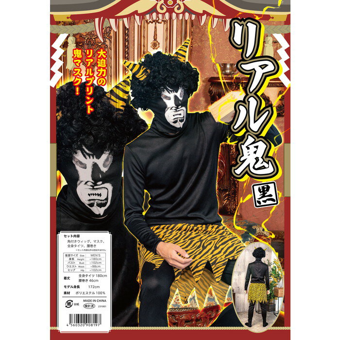 配送・ご注文についての注意事項 商品紹介 これぞリアルな鬼コスチューム!!子供が泣いても責任は取れません!マスク部分は迫力満点リアルな鬼の顔プリント!全身タイツやウィッグもセットになっているので、これを着るだけで誰でも恐怖のリアル鬼に変身できます。節分行事はもちろん、イベント、学園祭、お祭り、文化祭、忘年会、結婚式、余興、パーティー、ハロウィンなどに。 品番属性 JANコード4560320908197 型番 製造・販売/輸入元株式会社クリアストーン 広告文責株式会社フューテック/TEL:050-3609-3530 商品関連ワード商品仕様 セット内容角付きウィッグ、マスク、全身タイツ、腰巻き適用サイズMens/身長 〜180cm、B〜102cm、W〜98cm、H〜102cmメイン部分の長さ(着丈等)全身タイツ180、腰巻き46cm原材料・素材ポリエステル100%開き背中心ファスナー、マスクは後ろ面ファスナー洗濯表示洗濯機不可、弱い手洗い可、塩素系漂白剤による漂白不可、アイロンは中温で当て布使用、ドライクリーニング不可※クリーニングはお避けください。色落ちの可能性がありますので、他のものとの洗濯はお避け下さい。アイロンは、当て布使用して下さい。使用上の注意・生産時期やロット、デザインによって、多少サイズ・色・柄が異なる場合があります。摩擦や水濡れにより色移りする恐れがありますのでご注意ください。・視界が狭くなるので、危険な場所でのご使用は避け、安全な場所にて怪我などなさらぬよう、十分気を付けてご使用ください。・商品画像は可能な限り実物の色に近づくよう調整しておりますが、お使いのモニター設定、お部屋の照明等により実際の商品と色味が異なって見える場合がございます。又、同じ商品の画像でも、撮影環境によって画像の色に差異が生じる場合がございます。製造国中国