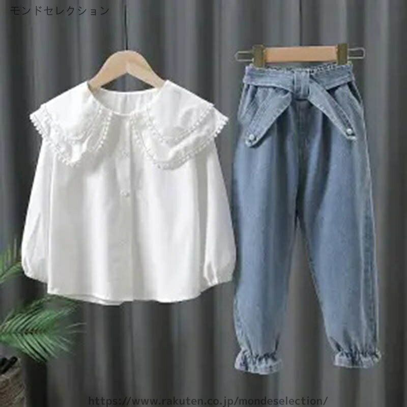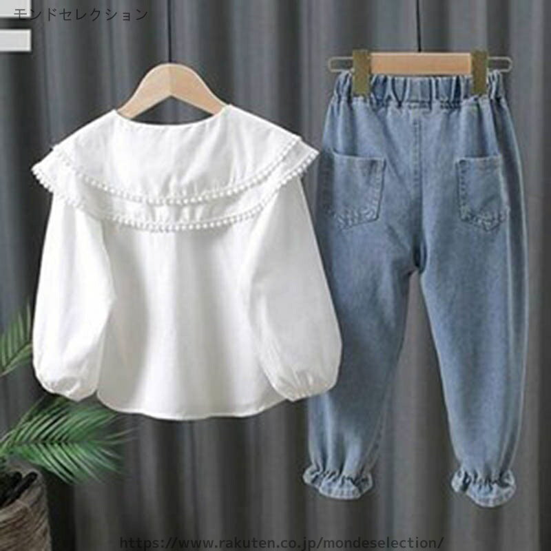 【送料無料】秋服 春服 リボン付きパンツ ビッグ襟ブラウス 女の子 2点セット キッズ セットアップ デニムパンツ 長袖ブラウス 上下セット
