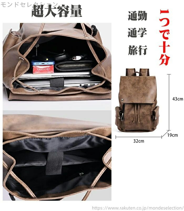 商品仕様 [複数の収納スペース]:バックパックのメインコンパートメントは、ノートパソコンが簡単に収納できる大きさです。 また、独立したポケットがいくつかあるので、財布や鍵などの小物をすぐに見つけることができます。 [寸法・重量]:長さ:32cm、幅:19cm、高さ:43cm。重量:約 1 kg [素材]: 生地:PUレザー。 裏地: ポリエステル. [バッグの構造]: メインポケット、コンパートメントポケット、ナローポケット、コンシールジップポケット、外ポケット。 [多機能バックパック]: バックパックは、職場や学校で持ち運んで使用することができ、収納しやすく、カジュアルなスタイルで、毎日の旅行、通勤、出張、アウトドア活動、ショッピング、学校での使用に適しており、学生、若者、男性と女性のためのユニークな贈り物。 素材 PUレザー、ポリエステル カラー ブラック、グレー、ブラウン サイズ フリーサイズ セット内容 バッグ 原産国 中国 注意事項 ※お客様のモニター環境により実物の色合いと若干お色目が異なる場合がございます。 ※商品生地、色合い、コサージュやその他装飾部品の色やデザイン等、生産時期によって、差異が生じます。 そのため、同じ商品を複数点ご購入の場合、場合によって色、コサージュのデザイン等差異がでる場合がございます。ご了承ください。 ※着用?保管頂きます際には他のものとの摩擦などにより色移りや傷になる場合が 御座いますのでご注意ください。 当店は他の店舗と在庫を共有し、商品の販売をおこなうとおりますため、ご注文をいただいた商品が在庫切れの状態になっている可能性をご承知おきください。 通常の商品は発送まで約5日間を予想しておりますが、発送前には全ての商品を精密に検査いたしますが、万一商品の汚損?破損?故障や在庫不足の状況が発生した場合は、当店より3営業日以内に電話または電子メールにてご連絡いたします。その際はご不便をおかけいたしますが、ご了承のほどよろしくお願いいたします。