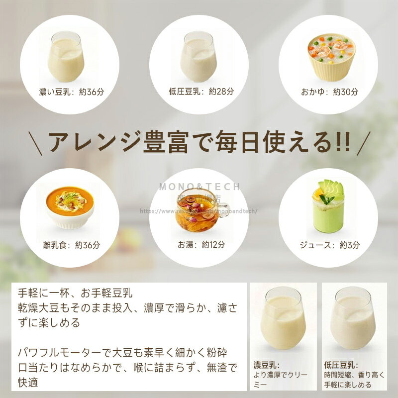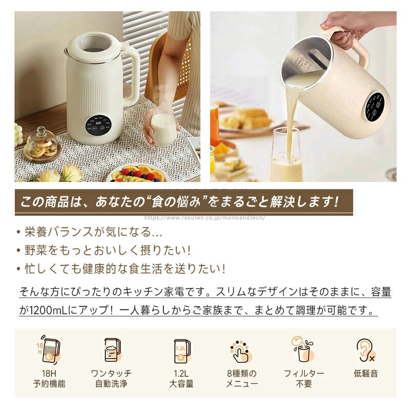 【商品説明】 商品名:豆乳メーカー、スープメーカー 定格電圧:110V~50Hz 攪拌出力:150W 定格容量:1L(温かい飲み物)/1.2L(冷たい飲み物) 加熱出力:800W 一台で多機能! この小型豆乳メーカーは、豆乳だけでなく、ハーブティー、ジュース、お粥、米ペーストなども作れます。赤ちゃんの離乳食や栄養食も手軽に調理可能。これ1台で家族みんなの好みに合わせた多彩なお料理が楽しめます。 ※発酵機能は搭載しておりません。 大容量1200mlで家族向け 最大容量1200ml(冷たい飲み物)/1000ml(温かい飲み物)で、2~5人分の調理に最適。 シンプルでスタイリッシュなデザインはキッチンに置いてもインテリアになじみやすく、毎日使いたい方にぴったりです。 大きな投入口で材料を入れやすく、注ぎ口付きでコップへの移し替えも簡単。 お手入れ簡単 洗浄機能付きで、刃の周囲などの洗いにくい箇所も簡単にお手入れ可能。専用の洗浄ブラシが付属しており、使用後の後片付けもスムーズです。 【日本国内使用について】 当商品は、日本規格2穴/3穴タイプのプラグが在庫状況により発送されます。 3穴タイプは一部の住宅では使用できない場合があります。(応していない場合は変換アダプターを同梱いたします) お家のコンセントをご確認のうえ、ご注文ください。 【ご注意】 ●サイズは実寸を手作業で採寸しているため、多少の誤差が生じる場合がございます。 ●ご覧のモニター環境により、実際の色味と若干異なる場合がございます。 ●品質には問題ありませんが、返品・交換の対象外とさせていただいております。ご了承の上、ご購入ください。 ●お急ぎの場合は、余裕をもってご注文いただきますようお願いいたします。 【送料について】 本土地域は送料無料です。 沖縄・離島への追加送料:1,800円 北海道への追加送料:800円 関連検索キーワード(商品説明ではありません):豆乳メーカー、全自動、破壁機、ミキサー、ブレンダー、スープメーカー、離乳食、ジュースメーカー、ポタージュ、スムージー、豆乳スープ、おかゆメーカー、家庭用、2~5人用、ろ過不要、加熱機能付き、簡単調理、自動調理器、健康志向、栄養調理、赤ちゃん用、ベビーフード、フルーツジュース、温冷両用、1台多役、忙しい朝、手作りスープ、豆乳作り、ナッツジュース、グリーンスムージー、薬膳スープ、豆乳シェイク、栄養満点、カフェ風ドリンク、時短調理、食材粉砕、ミル機能付き、コンパクト家電、毎日使える、洗いやすい、料理初心者、家族向け キッチン家電 お買い物マラソン 5と0の日 ワンダフルデー スーパーセール スーパーSALE