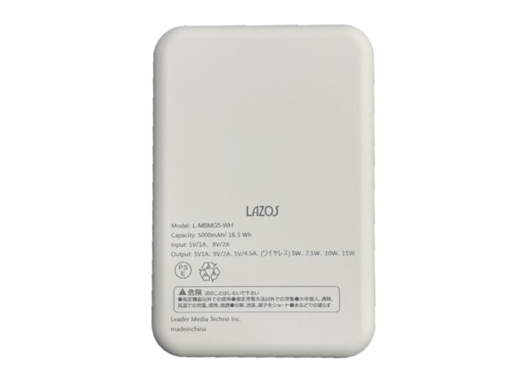 送料無料(北海道沖縄離島除く)モバイルバッテリー マグネット式ワイヤレス充電対応 5000mAh モバイル充電器 PSE適合 Lazos L-MBMG5-WH/2037x1個