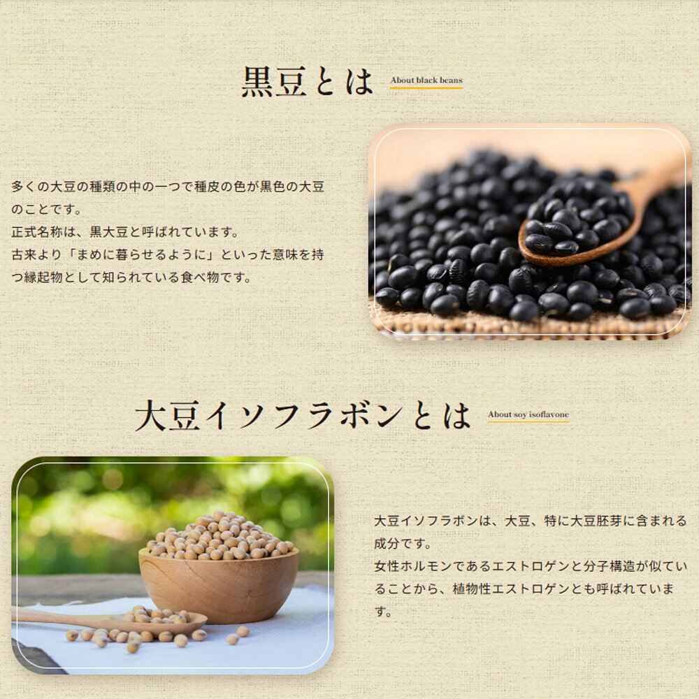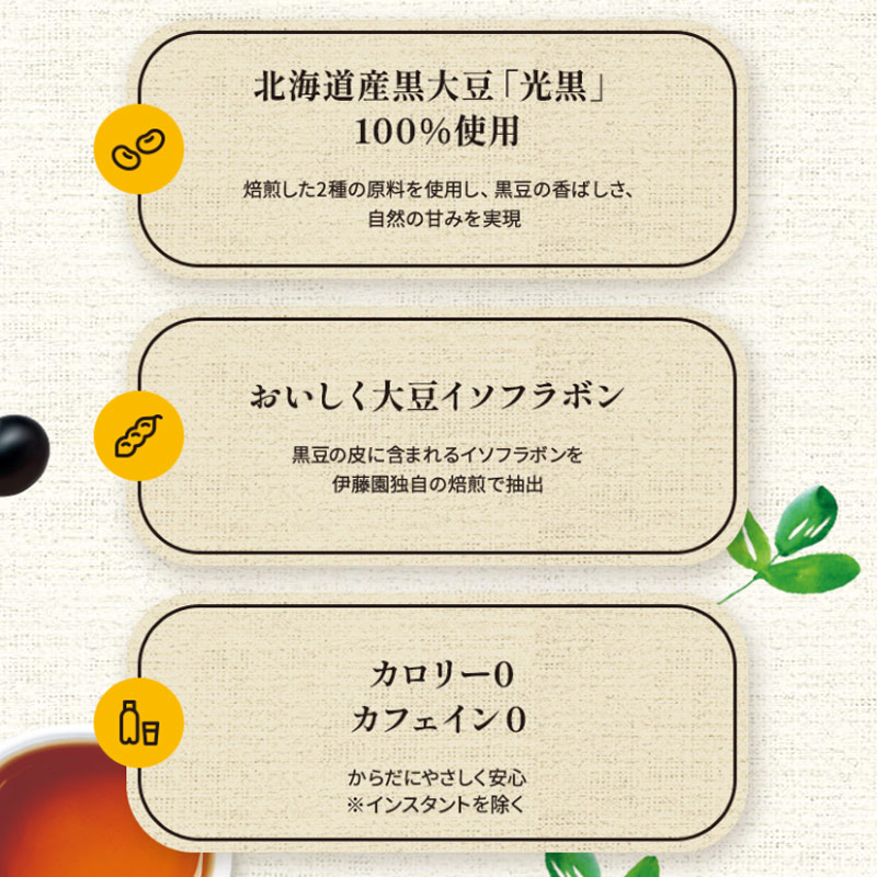 袋数はタイトル参照 さらさらとける おいしく大豆イソフラボン黒豆茶 32g 水でもお湯でもすぐとける 甘香ばしい インスタント黒豆茶 水でもお湯でもすぐにとける、カフェインゼロのインスタント黒豆茶です。 飲みたいときに飲みたい分だけ飲めて、マイボトルに便利。 黒豆のやわらかい香りと、豆本来の甘みをお楽しみいただけます。 栄養成分 エネルギー 3kcal たんぱく質 0.04g 脂質 0.004g 炭水化物 0.7g 食塩相当量 0.006g その他の栄養成分 カフェイン0mg、大豆イソフラボン1.4mg※ ※(当社分析値)諸条件により数値は変動します。 【表示単位:1杯(0.8g)当たり】 原材料 黒大豆(北海道)、デキストリン、大豆胚芽/ビタミンC 注意事項 メーカー都合にてパッケージ、デザイン、仕様変更等ある場合があります メーカー保証のあるものはメーカーの保証書付となります 輸入雑貨等メーカー保証の無いものに関しましても、 当社にて初期不良保証をお付けいたします。 弊社の販売物はすべて新品です。