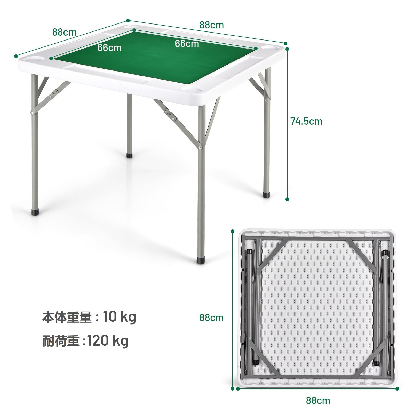 ・★本体サイズ(約)幅88x奥行88x高さ75cm ★折り畳みサイズ:幅88x奥行88x高さ5cm ★本体重量:10kg ★耐荷重:120kg ★材質:鉄+PE+PVC・【多目的麻雀テーブル】表面が平らで、麻雀、ポーカー、ドミノ、ブラックジャック、テキサスホールデムなど様々なテーブルゲームに最適な多目的折りたたみ麻雀卓です。そのため、クラブ、バー、ゲームルーム、家庭など、さまざまな場面で非常に適しています。・【折りたたみデザイン&持ち運びが簡単】従来の麻雀卓とは異なり、この麻雀卓は楽々と折りたたむことができ、使用しないときはスペースを節約することができます。さらに、旅行やキャンプの際にも持ち運びが可能です。また、安全性にも配慮し、折りたたんだ脚を固定するセーフティーロックを設け、取り扱い中に脚が外れないように設計されています。・【広々としたテーブルトップ】88cm×88cmの雀卓は、麻雀牌やトランプなどを置くのに十分なスペースがあります。同時に、プロ仕様のPVCテーブルトップは耐摩耗性に優れており、ゲームの楽しさを存分に味わうことができます。・【便利なカップホルダー&麻雀凹み】この麻雀卓は4つのカップホルダーと4つのチップ凹部があり、プレイヤーに大きな利便性を提供します。カップホルダーがはめ込まれているので、カップをきれいな状態に保ち、飲み物がこぼれるのを防いでくれます。さらに、丁寧に作られた麻雀の凹みは、プレイヤーが麻雀牌を整理するのに役立ち、特に初心者に優しいものとなっています。・【頑丈な構造&滑り止めデザイン】高品質のPE材料とパワーコーティングされた鉄フレームで作られ、この麻雀卓は非常に頑丈で耐久性があります。また、滑り止めの付いた脚は、床を傷から守りながら安定性を高めます。ハニカム構造により、120キロまでの重量に耐えられるマージャン卓です。・※麻雀牌は別売りです。予めご了承ください。