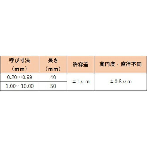>商品名:TRUSCO ピンゲージ 1.92TRUSCO コードNo: TEP-192オレンジブック発注コード:115-9315JANコード: 4989999952148>●JMAS規格に準じた径精度±1μmのスタンダードなピンゲージです。●0.99mmまではプラスチックケースに呼び寸法を表示しています。●1.00mm以上にはピンゲージにも呼び寸法をレーザー刻印しています。●最小呼び寸法0.2mmからはじまる0.01トビのピンゲージです。●(7.00から0.1トビ)●全品サブゼロ処理済みです。>●穴径の測定、穴の芯間測定に。●穴の位置・平行度の測定、芯ブレ測定に。>●呼び寸法(mm):1.92●長さ(mm):50●径精度:±1.0μm●真円度:0.8μm●硬度:HRC58以上>●真円度・直径不同:±0.8μm>●0.99以下:SKH51●1.00以上:SUJ2●ケース:ABS樹脂>->●ピンゲージの両端より5mmは外径精度保証の対象外です。●提供不可:chemSHERPA、ミルシート