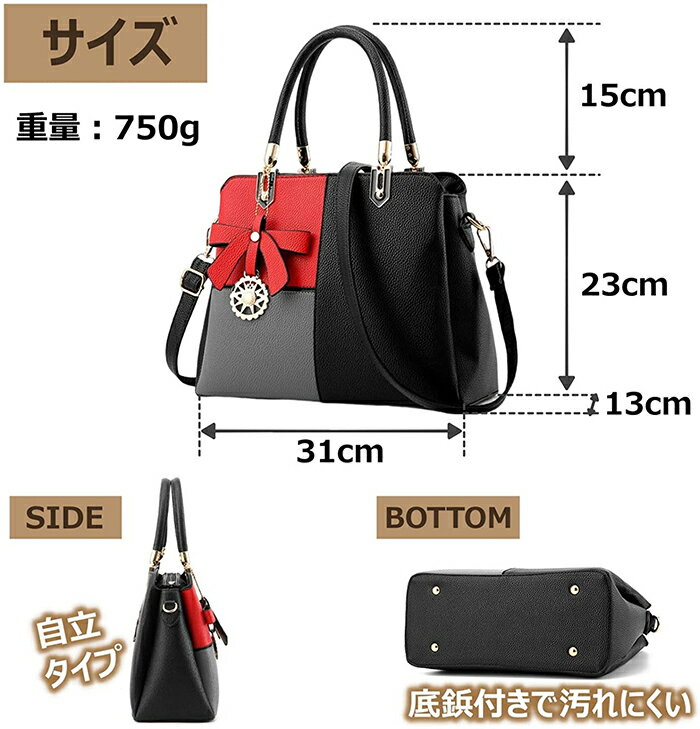 商品コード qs-bag13 商品仕様 【 大人カワイイ♪ 】高級感のあるシンプルデザインに、リボンチャームで可愛さをプラス☆通勤や通学・デートや女子会など様々なシーンで活躍してくれます。チャームは取り外し可能なので、フォーマルでも使える優れモノ♪ 【 収納力◎ 】スリムな外見からは想像できないほどの大容量収納♪(7ポケット)スマホ、お財布、リップなどの小物はもちろん、お弁当や水筒など、かさばるものもスッキリ収納!iPadもラクラク入ります♪ 【 機能性◎ 】2way(ハンド・ショルダー)、マチ付き、自立式、ファスナー付、底鋲付き、汚れにくい、型崩れ防止、耐水性、と嬉しい機能がたっぷり!デザイン性も機能性もバッチリなバッグです♪ 【 高見え◎ 】持ち手部分には高級感溢れるゴールドジョイントの留め具を採用。清楚で上品な印象を演出してくれます。素材もしっかりしているので、高級ブランドにも劣らない!コスパに厳しいアナタも大満足すること間違いなし♪ 【 簡単お手入れ◎ 】水はねや汚れに強い素材を使用しているので、雨の日でも安心♪万が一汚れても、ぬるま湯で濡らした布で全体を優しく拭くと、また綺麗なバッグがよみがえる!お手入れがラクラクです♪ 素材 PU カラー 写真通り サイズ フリーサイズ セット内容 バッグ単品 原産国 中国 注意事項 ※お客様のモニター環境により実物の色合いと若干お色目が異なる場合がございます。 ※商品生地、色合い、コサージュやその他装飾部品の色やデザイン等、生産時期によって、差異が生じます。 そのため、同じ商品を複数点ご購入の場合、場合によって色、コサージュのデザイン等差異がでる場合がございます。ご了承ください。 ※着用?保管頂きます際には他のものとの摩擦などにより色移りや傷になる場合が 御座いますのでご注意ください。