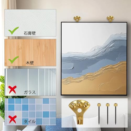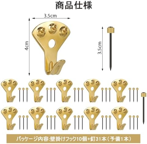【パッケージ内容】 壁掛けフック10個、取り付け用釘31個(予備の釘1本付き)。 カラーはゴールドで、サイズは3.5×4cm。 透明な収納ケースも付属しており、フックを清潔に保ちながら紛失や汚れを防ぎ、持ち運びにも便利です。 【高品質素材】 高品質の金属鉄を使用し、電気メッキ加工を施しています。 これにより、耐腐食性と耐久性に優れ、長期間安心して使用できます。 【簡単設置】 取り付けは非常に簡単で、付属の釘を壁に打ち込むだけ。 強力な釘でしっかり固定でき、大切な額縁やインテリアをしっかり守ります。 【壁を傷つけず安心】 再利用可能な釘は壁に穴を開けず、取り外し可能で小さなピンホールが残るだけ。 壁のダメージを最小限に抑えます。 【幅広い用途】 写真、額縁、絵画、時計、帽子、バッグ、鍵など、多種多様なアイテムを収納できます。 家庭やオフィス、キッチン、リビングルーム、バスルームなどで活躍し、空間をスッキリ整理できます。【パッケージ内容】 壁掛けフック10個、取り付け用釘31個(予備の釘1本付き)。 カラーはゴールドで、サイズは3.5×4cm。 透明な収納ケースも付属しており、フックを清潔に保ちながら紛失や汚れを防ぎ、持ち運びにも便利です。 【高品質素材】 高品質の金属鉄を使用し、電気メッキ加工を施しています。 これにより、耐腐食性と耐久性に優れ、長期間安心して使用できます。 【簡単設置】 取り付けは非常に簡単で、付属の釘を壁に打ち込むだけ。 強力な釘でしっかり固定でき、大切な額縁やインテリアをしっかり守ります。 【壁を傷つけず安心】 再利用可能な釘は壁に穴を開けず、取り外し可能で小さなピンホールが残るだけ。 壁のダメージを最小限に抑えます。 【幅広い用途】 写真、額縁、絵画、時計、帽子、バッグ、鍵など、多種多様なアイテムを収納できます。 家庭やオフィス、キッチン、リビングルーム、バスルームなどで活躍し、空間をスッキリ整理できます。