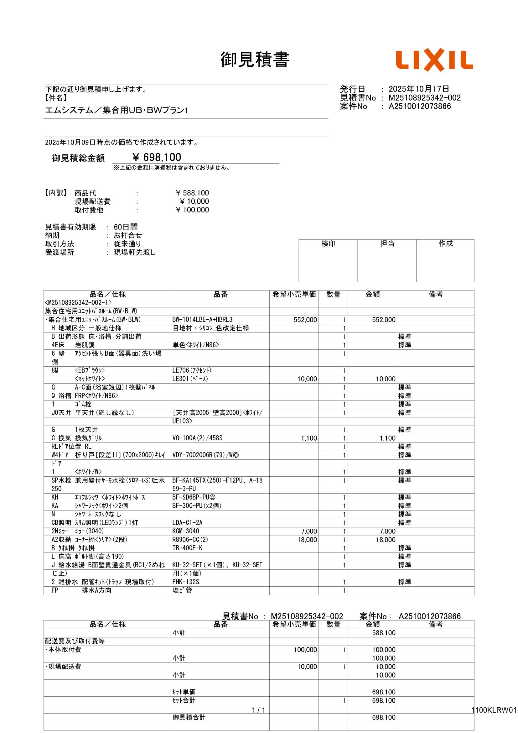 BW-1014LBE-A LIXIL 集合用システムバスルーム BW 1014サイズ
