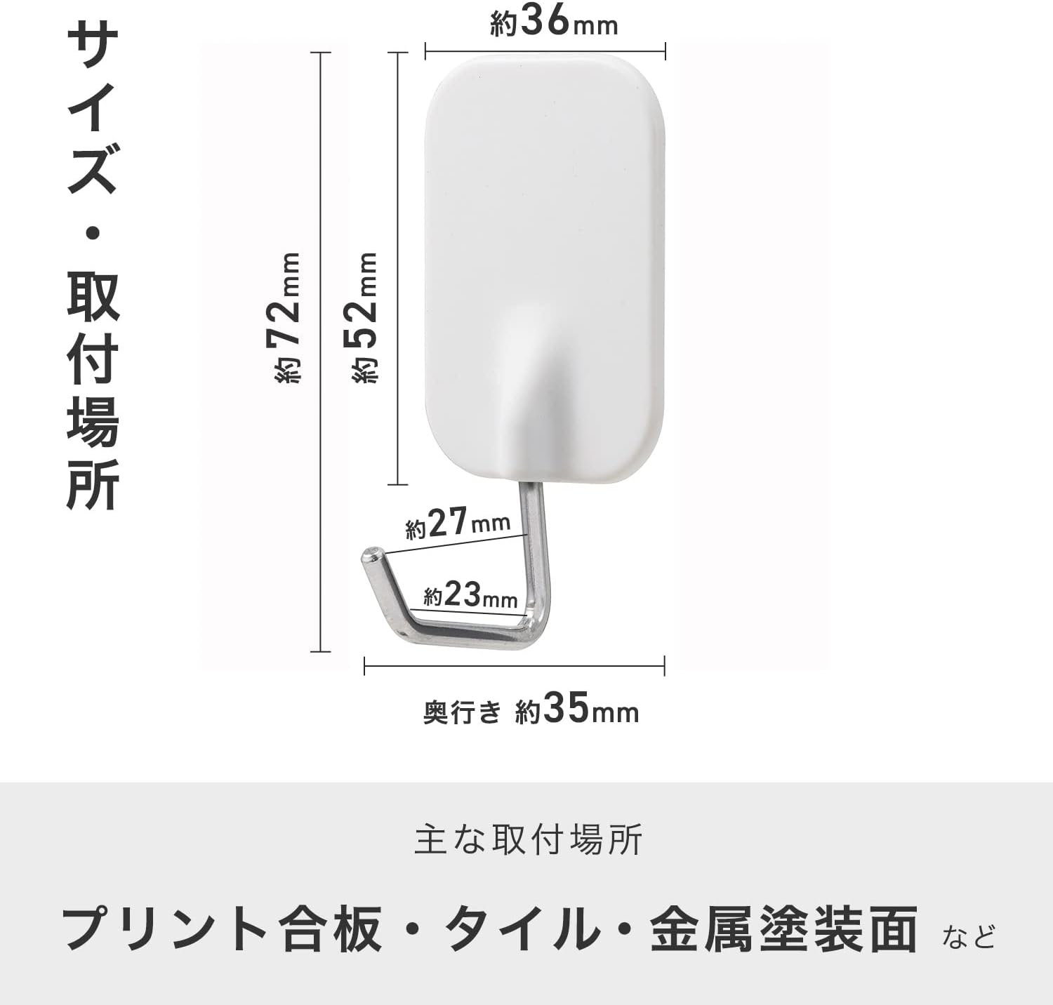 ●粘着テープで取り付けるタイプのフック6個入。●薄くても丈夫なポリカーボネート製。●フック部分に奥行があり厚みがあるものもかけられます。※メーカーの都合により、パッケージ・仕様等は予告なく変更になる場合がございます。耐荷重:約2kg 商品情報 サイズ商品サイズ:120×45×180Hmm重量・内容量内容量:6個生産国中国材質・成分支持部:ポリカーボネート、フック:ステンレス鋼線 162730