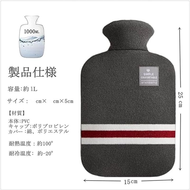 【サイズ】約25×15×高さ5cm【容量】:約1L。【材質】本体:PVC 。キャップ:ポリプロピレン 。カバー:綿、ポリエステル 【自然な温もり・経済的】電気を使わず、繰り返し使えるので、エコで経済的。お湯を入れるだけで肌の乾燥を気にせず、簡単ぽかぽか!エアコンの風が苦手な方にぴったりです。自然なぬくもりが体にうれしい、『頭寒足熱』型、昔ながらの暖房器具です。 【長時間保温・専用カバー付き】本体は高保温性、耐劣化性のある PVC素材を採用し、柔らかくて、安全な暖房アイテム。 従来品より厚みが増し(約2.3cm)多層PVC構造で、保温力アップ!時間は使用場所の環境によりますが、19℃ぐらいの環境で7時間保温できます。低温やけどを防ぐために、手触りがいいカバーを付けており、保温力をアップさせる効果もあります。 【幅広く用途】おうちでのご使用はもちろん、肌寒い日のキャンプや山登りなど、幅広い使い方があります。湯たんぽは体の血行を良くし、夏場は冷房の効きすぎによる冷え対策にも効果的!また、ストーブに近づいて危ないペットの暖房器具としても喜ばれています。 ※夏場で熱中症対策の氷枕やけがの応急処置アイスバッグとしてもご利用いただけます。 【取扱説明】沸騰したお湯を少し冷まして(80℃くらい最適)ゆっくりと2/3まで注ぐ。閉じ込められた空気をゆっくりと排出し、キャップをしっかり締めて、漏れがないことを確認してから使用してください。※使用方法を誤ると大事故や大けがにつながる危険があります。ご使用前には必ず取扱説明をよくお読みになり、十分に理解したうえでご使用ください。温かい湯たんぽが長時間身体の同じ場所に触れたままになると、低温やけどの危険があります。