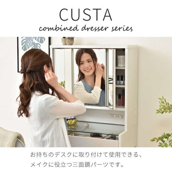 ■商品説明 お手持ちのデスクに取り付けて使えるドレッサーパーツ。メイクやヘアアレンジの際に役立つ三面鏡タイプです。ミラーの中には高さを調節できる棚がついているので、メイクグッズやボトル、スプレーなどもまとめて収納できます。■本体サイズ[外寸]幅60×奥行22×高さ58cm■その他サイズ[内寸] (左右ミラー扉内)幅13×奥行11×高さ41.5cm (中央ミラー扉内)幅23×奥行11×高さ41.5cm (可動棚小)幅13×奥行13.5×厚み1.2cm(3.2cmピッチ9穴) (可動棚大)幅25.5×奥行13.5×厚み1.2cm(3.2cmピッチ9穴) (ミラー下)幅56.5×奥行16×高さ13cm■材質[本体]プリント紙化粧合板■収納量・耐荷重[天板]約5kg以下 [可動棚大]各約2kg以下 [可動棚小]各約1kg以下■備考・可動棚:大2枚、小4枚 ・合計1500Wの2口コンセント付き(コード長さ196cm) ・背面化粧あり ・張力止め付き■生産国中国■組立時間(目安)(大人2人)お客様組立(30分)■キーワード三面鏡ドレッサー 収納 大きめ おしゃれ ドレッサー 大きい 後付け 鏡台 化粧台 コンセント シンプル ヘアアイロン 木目 大容量 ブラウン w1500 化粧鏡 卓上鏡 白 化粧ミラー 収納多い 収納多め 寝室 棚付き 茶色 メイク 木目調 ダークブラウン ドライヤー ミラーのみ 机上