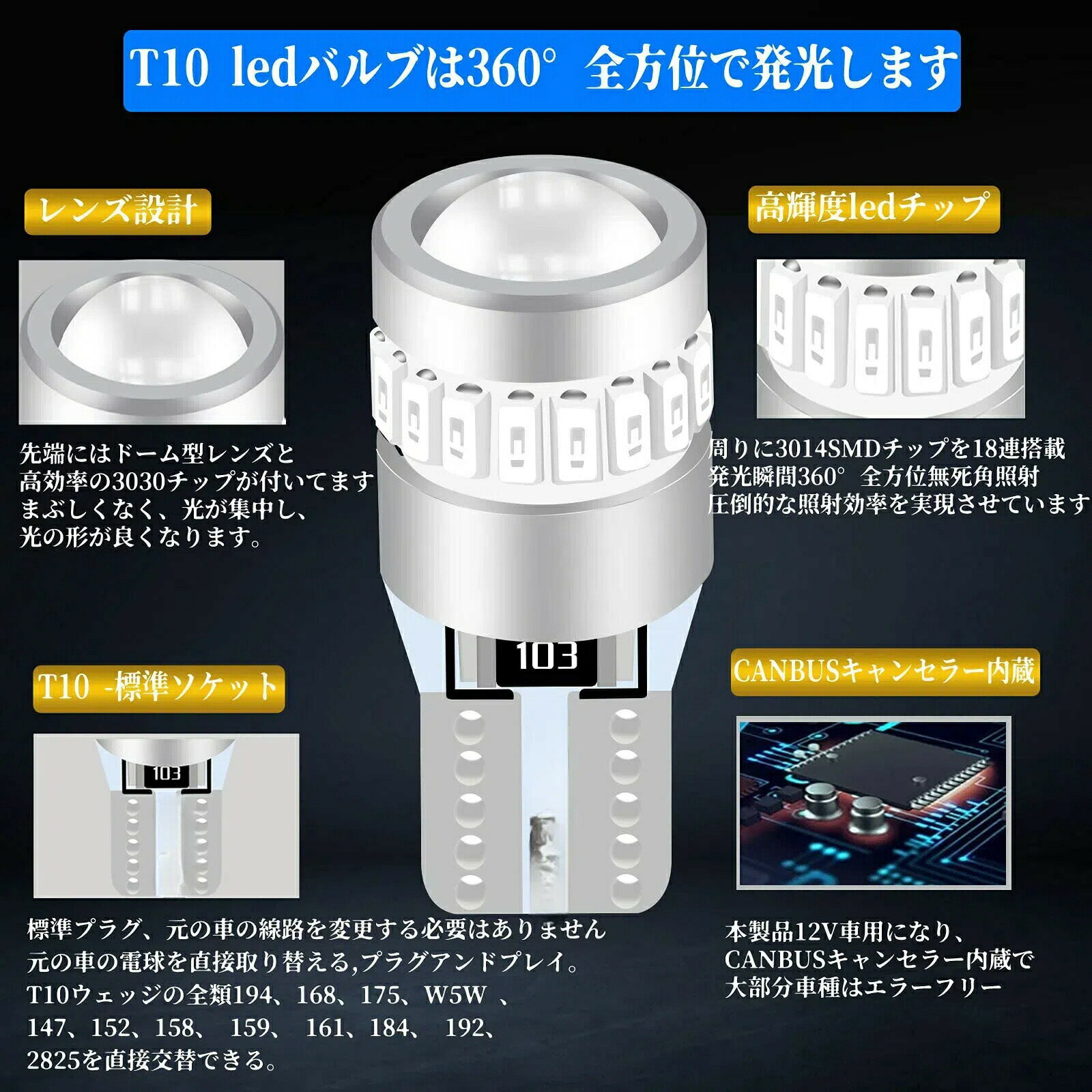 色: ホワイト電圧: 12V設置場所:中央光源種類 ハロゲン、LED:色温度 6500ケルビン:光源種類 ハロゲン、LED:色温度6500ケルビン【T10電球360度照明】先端にはドームレンズと高効率3030チップが搭載され、周囲には24個の高効率3014 LED素子が搭載されており、360度全方位照明を実現できます。明るく均一な光をリフレクターで反射し超高輝度を拡散し、圧倒的な照射効率を実現します。【T10 LED白色光超高輝度】LEDランプは超高輝度白色光を持っており、一般的なハロゲンランプT10より300%明るいです!従来品と比べて明るさが大幅にアップ!消費電力が約75%削減され、パフォーマンスが大幅に向上しました。【取り付け簡単な多用途LEDバルブ】純正バルブ(T10)とほぼ同じサイズなので、ナンバープレート灯、マップ灯、ドーム灯、フロント/リアサイドライト、トランクライト穴、方向指示器ランプ、読書灯はグローブボックスライト、テールライトなどに使用でき、ウェッジ電球と交換できます。無極性タイプなので挿入方向を気にせず使用できます。【優れた耐久性と長寿命】コンセント部分はアルミ素材と耐熱性放熱性に優れた特殊グラスファイバーボードを採用しており、へたりや接触不良の心配がありません。バルブの性能が保証されており、30,000時間以上の使用が可能で、ハロゲンランプに比べて100倍以上の長寿命です。色: ホワイト電圧: 12V設置場所:中央光源種類 ハロゲン、LED:色温度 6500ケルビン:光源種類 ハロゲン、LED:色温度6500ケルビン【T10電球360度照明】先端にはドームレンズと高効率3030チップが搭載され、周囲には24個の高効率3014 LED素子が搭載されており、360度全方位照明を実現できます。明るく均一な光をリフレクターで反射し超高輝度を拡散し、圧倒的な照射効率を実現します。【T10 LED白色光超高輝度】LEDランプは超高輝度白色光を持っており、一般的なハロゲンランプT10より300%明るいです!従来品と比べて明るさが大幅にアップ!消費電力が約75%削減され、パフォーマンスが大幅に向上しました。【取り付け簡単な多用途LEDバルブ】純正バルブ(T10)とほぼ同じサイズなので、ナンバープレート灯、マップ灯、ドーム灯、フロント/リアサイドライト、トランクライト穴、方向指示器ランプ、読書灯はグローブボックスライト、テールライトなどに使用でき、ウェッジ電球と交換できます。無極性タイプなので挿入方向を気にせず使用できます。【優れた耐久性と長寿命】コンセント部分はアルミ素材と耐熱性放熱性に優れた特殊グラスファイバーボードを採用しており、へたりや接触不良の心配がありません。バルブの性能が保証されており、30,000時間以上の使用が可能で、ハロゲンランプに比べて100倍以上の長寿命です。
