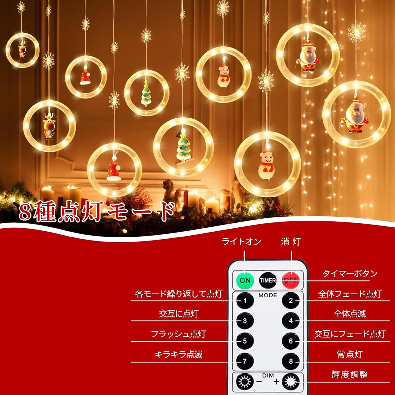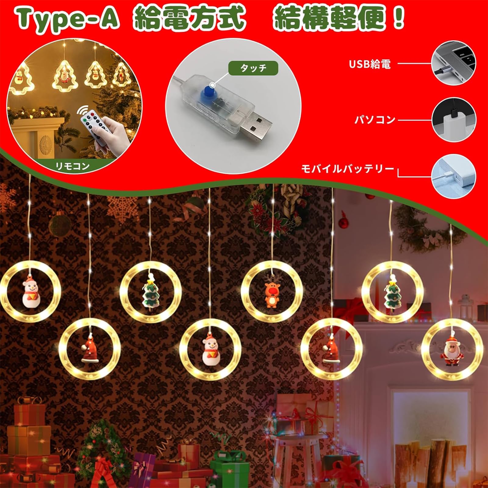 · 【クリスマス雰囲気溢れる】可愛くて、クリスマス雰囲気が溢れます。暖かいLEDリングは良い照明効果と暖かい雰囲気を作り出し、クリスマス雰囲気を加えます。クリスマスイルミネーションに照らされて、親しい友人たちにクリスマスの楽しさを体験させ、クリスマス特有の祝日の雰囲気を屋内屋外の隅々まで浸透させ。· 【多種類の点灯モード】全8種類の点灯パターンがあります。リモコンで、点灯パターンを設定できます。賑やかなシーンもロマンティックなシーンもお好みに合わせて演出できます。きらきら飾りLEDジュエリーライト子供にも、大人にも大人気です。· 【USB充電式エネルギー】USBインターフェースはバッテリー購入の必要がありません、クリスマス飾りライトは5Vの低電圧で動作します。コンピューター、USBアダプター、モバイルなど、USBインターフェースを備えたあらゆる機器に接続できます。紫外線や赤外線を含まない優しい光線で、損害なしで目を保護します。· 【取付簡単防水デザイン】主線にホックがついていますので、壁に引っ掛けることの出来るフックを用意して吊り下げるだけです。イルミネーションライトは低圧だけでなく、安心して使えます。防水ですが、雨や雪の日にも利用できます。· 【色んなシーンで活躍】クリスマスツリー飾りにはもちろん、屋内のクリスマス会クリスマスパーティー、イベント、祭りの装飾からお部屋のインテリア、お店のディスプレイとしても屋外のキャンプや玄関などのデコレーションとしても、色々な場所で飾られ!クリスマス雰囲気を演出しますお部屋の装飾、窓やベランダ、クリスマスツリーなど気軽に飾ることができます。いい雰囲気を作るのにぴったりです。ハロウィン、クリスマスなどのイベント時の飾りとして、応用範囲は庭、裏庭、レストラン、クリスマス、結婚式、誕生日パーティーなどです。【多種類の点灯モード&USB電源】リモコンが付属しているので、お客様はリモコンを使って遠隔操作を行うことができ、リモコンを使ってランプの明るさを調整することもできます。また、製品には8つのモードとタイミング機能があります便利なUSB式ストリングライトはUSB給電を採用し、わずか5V電圧で従来のよりもっと便利性をアップ!モバイルバッテリー、パソコンのUSBポート等から電源供給可能です。取付簡単クリスマスライトの主線にホックがついていますので、クリスマスツリーや壁に引っ掛けることの出来るフックを用意してこのライトを吊り下げるだけです。可愛いクリスマスチャーム付きLEDリングは素晴らしい照明効果と暖かい雰囲気を作り出し、ロマンチックな雰囲気を加えます。· 【クリスマス雰囲気溢れる】可愛くて、クリスマス雰囲気が溢れます。暖かいLEDリングは良い照明効果と暖かい雰囲気を作り出し、クリスマス雰囲気を加えます。クリスマスイルミネーションに照らされて、親しい友人たちにクリスマスの楽しさを体験させ、クリスマス特有の祝日の雰囲気を屋内屋外の隅々まで浸透させ。· 【多種類の点灯モード】全8種類の点灯パターンがあります。リモコンで、点灯パターンを設定できます。賑やかなシーンもロマンティックなシーンもお好みに合わせて演出できます。きらきら飾りLEDジュエリーライト子供にも、大人にも大人気です。· 【USB充電式エネルギー】USBインターフェースはバッテリー購入の必要がありません、クリスマス飾りライトは5Vの低電圧で動作します。コンピューター、USBアダプター、モバイルなど、USBインターフェースを備えたあらゆる機器に接続できます。紫外線や赤外線を含まない優しい光線で、損害なしで目を保護します。· 【取付簡単防水デザイン】主線にホックがついていますので、壁に引っ掛けることの出来るフックを用意して吊り下げるだけです。イルミネーションライトは低圧だけでなく、安心して使えます。防水ですが、雨や雪の日にも利用できます。· 【色んなシーンで活躍】クリスマスツリー飾りにはもちろん、屋内のクリスマス会クリスマスパーティー、イベント、祭りの装飾からお部屋のインテリア、お店のディスプレイとしても屋外のキャンプや玄関などのデコレーションとしても、色々な場所で飾られ!クリスマス雰囲気を演出しますお部屋の装飾、窓やベランダ、クリスマスツリーなど気軽に飾ることができます。いい雰囲気を作るのにぴったりです。ハロウィン、クリスマスなどのイベント時の飾りとして、応用範囲は庭、裏庭、レストラン、クリスマス、結婚式、誕生日パーティーなどです。【多種類の点灯モード&USB電源】リモコンが付属しているので、お客様はリモコンを使って遠隔操作を行うことができ、リモコンを使ってランプの明るさを調整することもできます。また、製品には8つのモードとタイミング機能があります便利なUSB式ストリングライトはUSB給電を採用し、わずか5V電圧で従来のよりもっと便利性をアップ!モバイルバッテリー、パ
