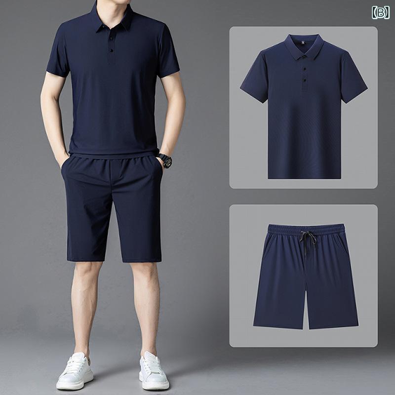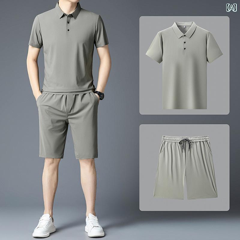 ・カテゴリ: メンズカジュアルセットアップ・スタイル: ライトビジネス・厚さ: 薄手・主な素材: 桑蚕シルク100%・トップススタイル: Tシャツ・トップス袖丈: 半袖・パンツ丈: ショート・適用シーン: カジュアル・カラー展開: カーキ、ネイビー、ブラック、グレーグリーン・サイズ展開: M、L、XL、2XL、3XL、4XL