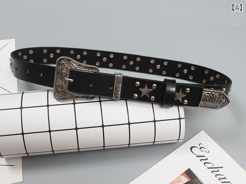 ベルト レディース 本革 牛革 ブラック スター スタッズ パンク ロック レトロ 彫刻デザイン ピンバックル 太め 幅広 Y2Kファッション ギャル ストリート オシャレ カジュアル