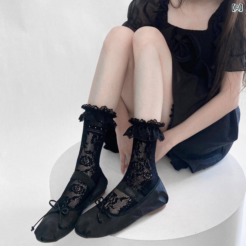 靴下 レディース 滑り止め 摩擦防止 日系 JK バレエ風 ロリータ 甜美 レース フリル 透かし編み ネットデザイン ミドル丈 くしゅくしゅソックス 春夏 オフホワイト ブラック