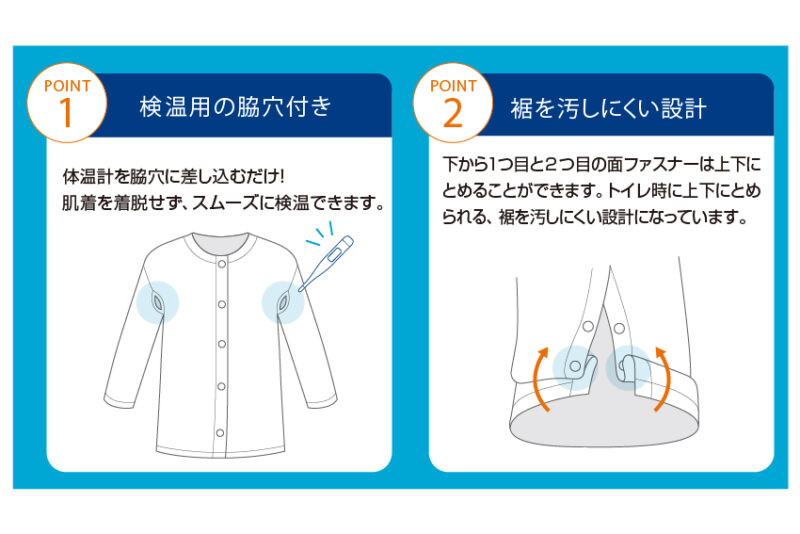 ■製品特徴 ●綿100%でソフトな肌触りのワンタッチ肌着です。 ●検温用の脇穴付きで肌着を脱着せず、スムーズに検温ができます。 ●下から1つ目と2つ目の面ファスナーは上下にとめる事ができ、裾を汚しにくい設計になっています。 ●面ファスナーで簡単に脱着できます。 ●ベビー肌着にも使用されている無蛍光素材、綿100%を使用しておりお肌に優しい肌着です。 ■サイズ(cm) 紳士 M:胸囲 88-96 紳士 L:胸囲 96-104 紳士 LL:胸囲 104-112 婦人 M:バスト 79-87 婦人 L:バスト 86-94 婦人 LL:バスト 93-101 ※規格は半袖・八分袖共通です。 ■材質 綿 【お問い合わせ先】 川本産業 電話:06-6943-8956 ■広告文責:N丁目薬品株式会社 作成:202204S 兵庫県伊丹市美鈴町2-71-9 TEL:072-764-7831 製造販売:川本産業 区分:衣類