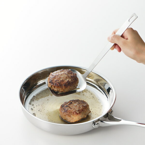 ・ 製品サイズ / 約 全幅 8.4 × 全長 30.0 × 高さ 6.7 cm・ 材質 / 18-8ステンレス ・ 重量 / 約 110g・ 生産国 / 日本 ・ ステンレス加工の新潟県燕三条産。ハンバーグやお肉をフライパンから取り分ける時にソースやタレも一緒にすくえるよう、縁にはゆるやかなアールがついています。小振りなフライパンでもすくいやすいように先端は薄く細身に、奥は食材をしっかりとキープできるように幅広になっています。ハンドルはつぎ目がないため汚れがたまりにくく、手に馴染んで使いやすい形状です。耐久性と耐蝕性に優れた18-8ステンレスを使用しています。