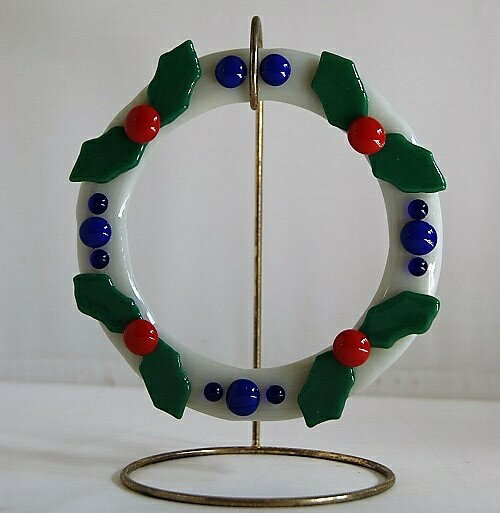 フュージング【膨張係数を合わせた専用のガラスでパーツをカットし形作ってキルン(お釜)で焼成】作品。 壁や窓に掛けたり、ワイヤースタンドに下げて窓辺、テーブル等何処にでも置いて、クリスマスのインテリアとしてお使い頂けます。 リング、葉、実と別々に焼成して、ガラスボンドで貼り付けリースにしました。大変手間の掛った作品です。 サイズ リングの直径・13.5cm、幅・2cm ワイヤースタンドは別売りです。(H17cm,台座10cm)10個のみ。送料無料 クリスマスリース ガラスリース クリスマスプレゼント ツリー飾り 玄関飾り 窓飾り