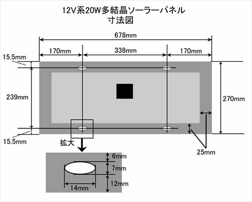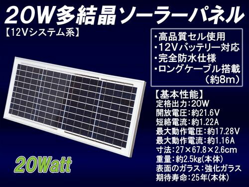 車・船のバッテリ補充電に最適な!蓄電用ソーラーパネル太陽電池タイプ : 独立電源用/蓄電用用途 屋外セル種類と特徴 : 多結晶光源 直射日光システム電圧 [V] : 12V最大動作電力 [W] : 20W最大動作電圧 [V] : 17.28V最大動作電流 [A] : 1.16A開放電圧 [V] : 21.6V短絡電流 [A] : 1.22A寸法 [mm] : 270×678×26重量 [kg] : 2.5kg標準接続 : 約8mケーブル付属。ワニ口クリップ付き。材質 : 耐腐食コーティングアルミフレーム枠、強化ガラス利用温度範囲 : -40℃から80℃ポイント : 逆流防止ダイオード標準内蔵。綺麗なセルで配列が適切この品を選ぶ理由 非常に安価!コストパフォーマンスに優れています。出力期待値:25年利用で80%の出力・y-solar 5W〜30W の太陽電池付属ケーブル仕様楕円型2芯ケーブル被覆を含めた太さ:縦5mm,横3mm銅線太さ:0.5sq許容電流:3A太陽光発電量と発電量での利用時間目安(ロスを考慮せず)?一日の日照時間 3〜6時間での発電量の目安 [Wh] : 60 〜 120Wh一日の日照時間での電気製品ご利用目安?10Wの照明などの利用目安 [時間] : 6 〜 10h30Wのノートパソコンなどの利用目安 [時間] : 2 〜 4hバッテリーの推奨容量の目安 [Ah] : 14Ah 〜店長推奨のバッテリー : ボイジャー?,?G&Yu密閉?,?CCB?,?BPC12など。大容量バッテリーの補充電に店長推奨の主な充放電コントローラー/12V : SA-BA10?,?SA-MN05-8?,?SS-6L?など、[ 充電コントローラの必要性? 12V バッテリーへの接続について ]☆バッテリ容量と太陽電池の発電量のバランスにより過充電防止のために充電コントローラを使用します多結晶 ソーラーパネル 5W - 12V / y-solar の場合、30Ah 12V より小さなバッテリーでは充電コントローラーをご利用ください。多結晶 ソーラーパネル 8W - 12V / y-solar の場合、50Ah 12V より小さなバッテリーでは充電コントローラーをご利用ください。多結晶 ソーラーパネル 10W - 12V / y-solar の場合、60Ah 12V より小さなバッテリーでは充電コントローラーをご利用ください。多結晶 ソーラーパネル 15W - 12V / y-solar の場合、80Ah 12V より小さなバッテリーでは充電コントローラーをご利用ください。多結晶 ソーラーパネル 20W - 12V / y-solar の場合、90Ah 12V より小さなバッテリーでは充電コントローラーをご利用ください。多結晶 ソーラーパネル 30W - 12V / y-solar の場合、160Ah 12V より小さなバッテリーでは充電コントローラーをご利用ください。*上記以外の y-solar は、逆流防止は付いていませんので、必ず充電コントローラーをご利用ください。?○ ロット価格のご案内が出来ます。お気軽にご連絡ください。 [ 限定販売 ] 格安のソーラーパネル!発電能力あたりの価格が安くなりますので多く利用するほど経済的です。(4枚以上の場合はさらに安くなりますのでご連絡ください)1枚の蓄電用から、数キロワットのシステムまで、導入費用が下がります。 [ 特徴 ] コストパフォーマンスが非常に高い太陽電池です。しっかり発電!確実に充電します! 価格の割に作りが綺麗です。実用性は十分であり見た目も許容範囲です。 丁寧な生産作業がわかります。(注意:シャープや京セラなどの日本メーカー製はフレームを含む作りが非常に綺麗ですので比較すると雑に見えますがご理解ください) とにかく安く!だけど、しっかりした製品を!安心できる保証が欲しい! このご要望にお答えいたします! 太陽電池の発電能力には、当店の通常保証が付いていますので安心です。 独立電源用のスタンダードソーラーパネル キャンピングカー、ボート、ベランダ発電、山小屋、照明装置、無線用電源などの独立型ソーラー電源として利用されています。 独立電源用のソーラーパネルは、システム電圧がバッテリーと同じですのでバッテリー蓄電に最適です。独立電源用のソーラーパネルを利用すると周辺機器が豊富で安価です。 独立型太陽光発電システム用に設計した使いやすいソーラーパネル(モジュール) バッテリーで運用するソーラー独立電源システムに最適です。 豊富な周辺機器を安価に利用できます。 ○ 発電効率の高い結晶セルの利用により効率のよい面積で高電力を発電。 狭い面積での高出力を可能としています。 ○ 設置するのに程よい寸法で縦横に配置することでお好みの形で増設できます。 このソーラーパネルは、発電部分のセルをガラスで保護しておりフレームとしてはアルミフレームで保護されています。 アルミフレームには取り付けようのビス穴が御座いますので、それらを利用してアングル・ステー・単管パイプなどに固定します。 設置のポイント!設置で重要なことは、ソーラーパネルは屋外で利用し様々な気象条件にさらされることを考慮して、台風などで飛ばされたり外れたりしないように確実に固定することです。設置方向は南向きで緯度と同程度の角度が理想とされておりますが、小規模なシステムの場合は南向き30〜40度程度でご利用下さい。また、大切なのは直射日光が確実に当たり日射時間を多くとることです。建物や木など周囲の状況を確認下さい。また、季節により太陽の角度が変わります。どの季節