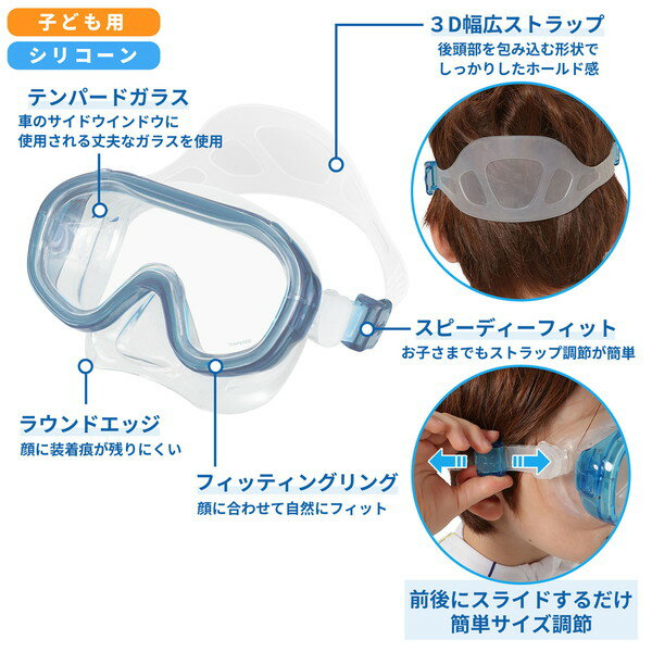 仕様/規格●素材:「マスク」レンズ/テーパードガラス、マスクスカート/シリコーン、マスクフレーム/ポリカーボネイト、マスクストラップ/シリコーン、シュノーケル:パイプ/PVC、アダプター/POM、マウスピース/シリコーン●仕様:存分にシュノーケリングが楽しめる!水漏れ防止機能付きマスクとシュノーケルのシュノーケリングセット●特徴:後頭部の湾曲に沿わせた3D幅広ストラップでしっかりホールド。ストラップがずれてきてしまう心配がありません。●サイズ:マスクフレーム/7.7×14.9cm、シュノーケル外形/38.3×11.8cm●重量:マスク/209g、シュノーケル/116g●内容量:シュノーケル/92ml●性別:ジュニア●原産国:台湾●マスク:アジャスターを前後にスライドさせるだけで簡単フィッティング!簡単に水漏れしないぴったりフィッティングができます。カラースモークブルー(SBL)メーカー品番RC0212関連ワード●レジャー用品ジャンル識別情報:/g1037/g218/g309/m247/※納期表示のご説明はこちら