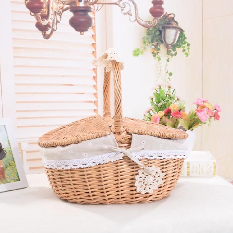 ピクニックバスケット ミニ かごバスケット フタ付き 蓋付き ワンハンドル 持ち手 取っ手付 レース 内布付き 帆布張り ピクニック バスケット 籠 籐 ラタン 編み かご バスケット 籐かご 籐バスケット 収納ボックス キャンプ ピクニックかご ナチュラル