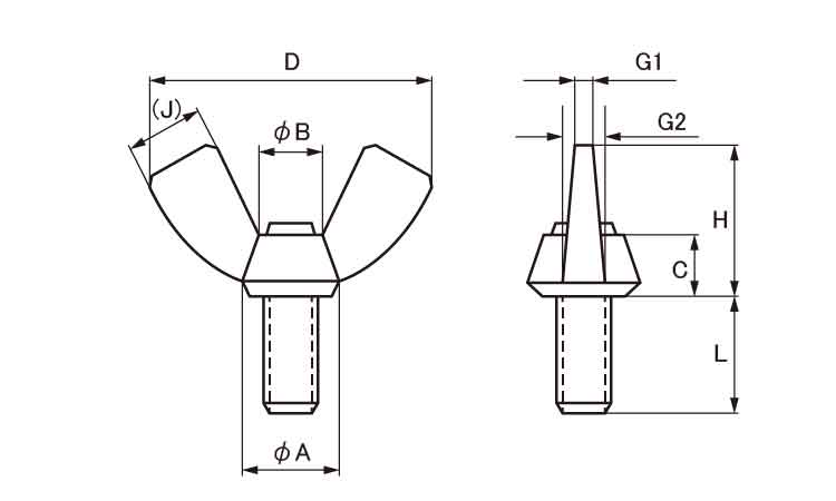 商品画像は白黒のため、実際の商品とは異なります。サイズの表記は「呼び径d(ねじの径)×長さL(図面上のLの長さ)」になります。JANコード:4942131944128つまみねじの類の商品になり、工具を使用せずとも、手締めで簡単に固定することが出来ます金具などの角度調整・パイプなどの高さ調整・固定などに使用される事例もございますワッシャー・SWなどの取付の手間を省ける、組込み品も展開しております(寸法に限りあり)よろしければ一度検索してみて下さい※「蝶ボルトP=3」でスムーズに検索可能です蝶ボルトはJIS規格上 1種 2種 3種と種類がございますまた、冷間圧造 ロストワックス(以前は鋳造でした) プレス加工 など様々な製造方法がございますので、お見積り・ご選定の際にはご指示をお願い致します材質は金属以外でも樹脂(ポリアセタール)でも取り扱いがございます商品群が変わってしまいますので、検索の際には「ポリアセ蝶ボルト」もしくは「K000B020」(←弊社商品コード)で検索可能ですサンコー社員の独り言・・・JIS B 1184 で管理されており、1種「翼端は半円形とする」 2種「翼端は角形とする」 3種「翼端は規定しない」とあるのに、注意書きとして「頭部の形状及び製造方法は、1種及び2種は特に規定しないが、3種は板のプレス加工による」と書かれています。頭部についてはよくわからない表現になっておりますが、3種がプレス加工と言うことだけはしっかり書かれています。どうとらえて良いのか難しい表現ですが、実は蝶ボルトは、JISにほとんど準じていますが、メーカー規格管理のメーカーが多いので、考え込んでも仕方がないところでもあるとも思っていますサンコー社員の独り言・・・JIS規格上、2種のM4の羽根幅は17となっていますが、弊社の仕入先各社の羽根幅は21をです。(M5と同じ羽根幅)これは、蝶ボルトは手で締めることが主流なので小径の方が好まれる傾向がございます(M4 M5など)その中で、昔々に「M4の頭部が小さくてつまみづらいから大きくして欲しい」と言う、ユーザーからの声が多く上がったため、ネジ径が1つ上のM5の頭部規格を採用することにしたそうです(幅17でも生産は可能ですが、受注生産品扱いになります 一般展開はしておりません)JIS規格では「大きい翼部を必要とする場合は一段上の頭部寸法を用いてもよい」という文言もあるため、この部分を採用しておりますので規格の範囲内ですただ、管理上メーカー規格として販売することにしたという経緯がございます少々難しい話でしたが、いかにこの商品が愛されているかを象徴する出来事ですねサンコー社員の独り言・・・手締め出来るという特長がある商品ですが、ビットやソケットも販売している工具メーカーさんもいらっしゃいます(ビニールハウスなど農家の方々向けに売り出しているようです)確かに、ビニールハウスなどでは沢山使うので工具の要望が多かったのかもしれないですね※販売先各社ともに安全なトルク管理を強調されております※蝶ボルトメーカー各社も工具での締付はトルクがかかりやすいので扱い注意と言われております材質・表面処理・サイズ・入り数(箱・バラ)違い品一覧はこちらをクリック→冷間蝶ボルト(R)カテゴリボルト