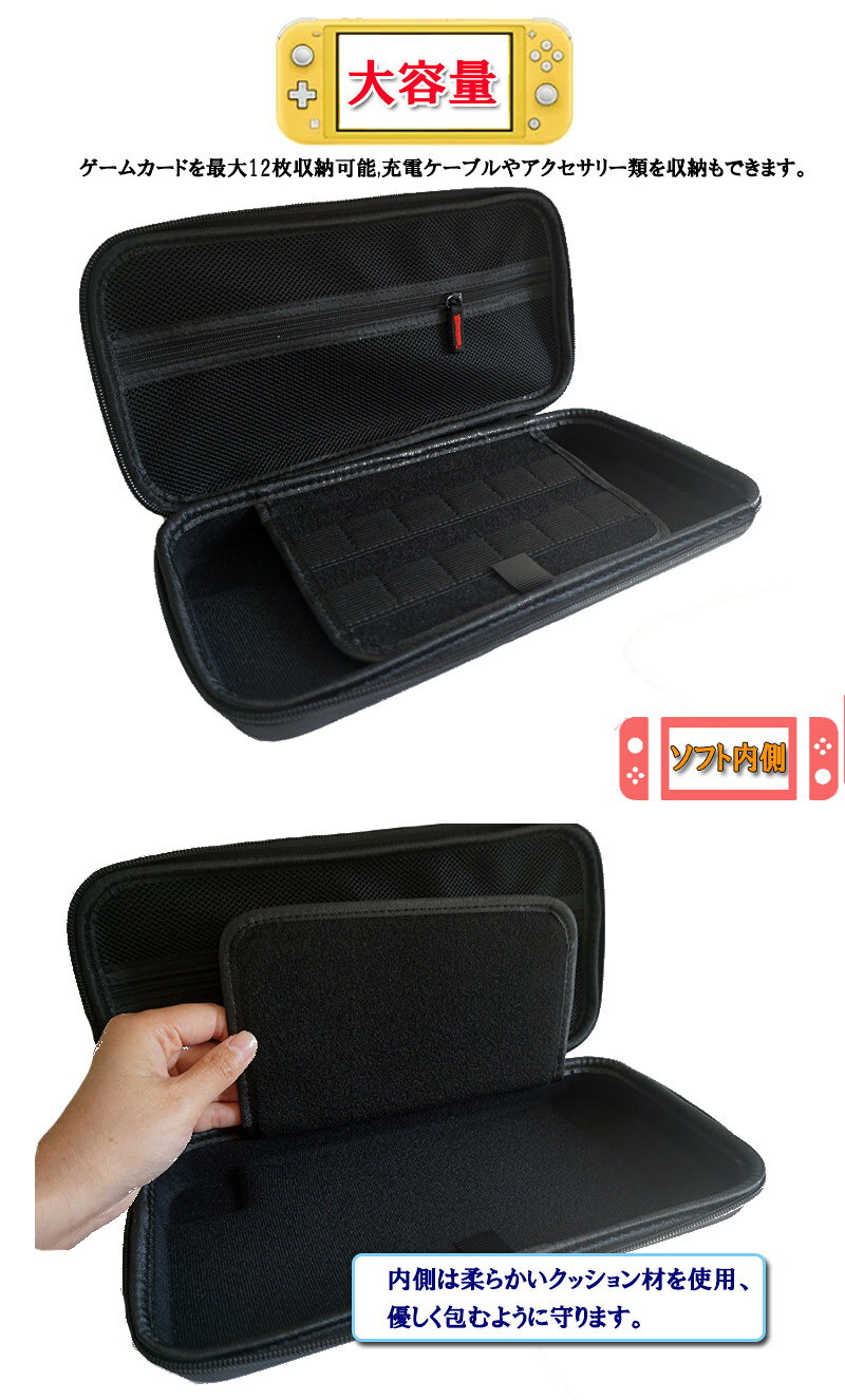 ケースの外側は衝撃吸収に優れたEVA素材を採用。軽量設計のSwitch2専用のセミハードケースです。 見た目がスッキリなファスナーを採用し、両サイドどちら側からでも開閉がしやすくデザインにこだわったダブルファスナー仕様。 Switch2収納スペースには落下防止バンドを搭載。ケースを開けた際にSwitch2を落下させてしまうトラブルを防ぎます。 持ち手部分を付属し、持ち運びやバックから取り出しやすい! ゲームカードを最大12枚収納可能、アクセサリ類を収納できるメッシュポケット付きで、持ち手もついて保管や持ち運びがしやすいNintendo Switch(有機ELモデル)専用セミハードケース。衝撃に強いセミハードケースは衝撃吸収に優れており、硬度9Hのガラスフィルムによって傷や汚れから画面を守り。 <特長> ●Nintendo Switch(有機ELモデル)専用セミハードケースです。 ●セミハードケース、ガラスフィルム、クリーニングクロスの3点セットです。 ●セミハードケースは、EVA素材を採用している為、衝撃に強いです。 ●画面保護用のガラスフィルムは、表面硬度9Hで傷や汚れから守ります。 ●指紋や汚れを拭き取るクリーニングクロスが付いています。 ●ケース内面は、柔らかい起毛素材を採用し本体に傷が付くのを防ぎます。また、本体を固定できるバンドが付いています。 ●ゲームカードを最大8枚収納できるポケットが付いています。 ●アクセサリー類を収納できるメッシュポケット付きです。 ●手提げタイプの持ち手付きなので、持ち運び時に便利です。 <仕様> ■サイズ:約W295×D140×H55mm(突起物を除く) ■材質:ケース/EVA ■付属品:ガラスフィルム/表面硬度9H ※この製品はオリジナル製品であり、任天堂株式会社のライセンス商品ではありません。
