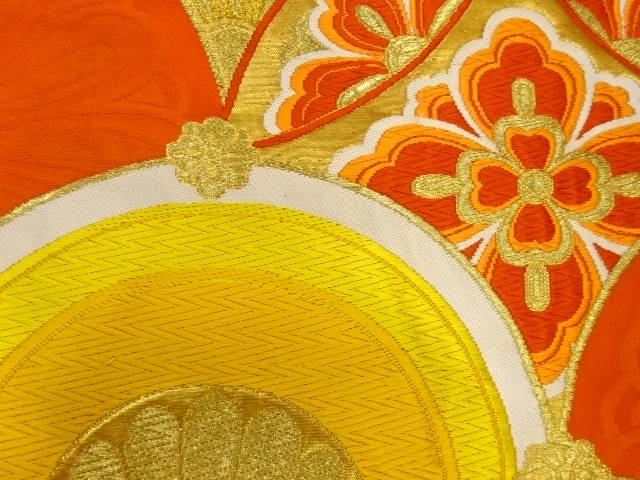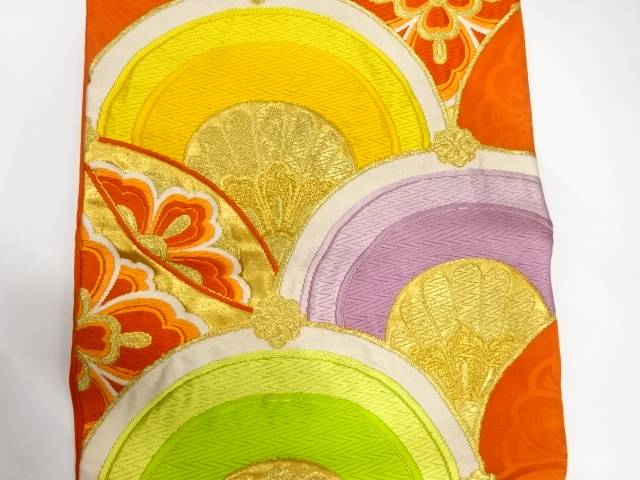 <帯サイズ>(単位:cm) 長さ 416 幅 30.5 状態 非常によい 素材 正絹 色目 朱 【商品説明】 帯幅部分の折れ山線に薄くすみが有ります。 その他、柄白地部分に薄アクと柄部分に数点の糸のうきが有ります。 状態は大変良いです。 着用可能です。 採寸:検品:花内・木村 撮影:花内