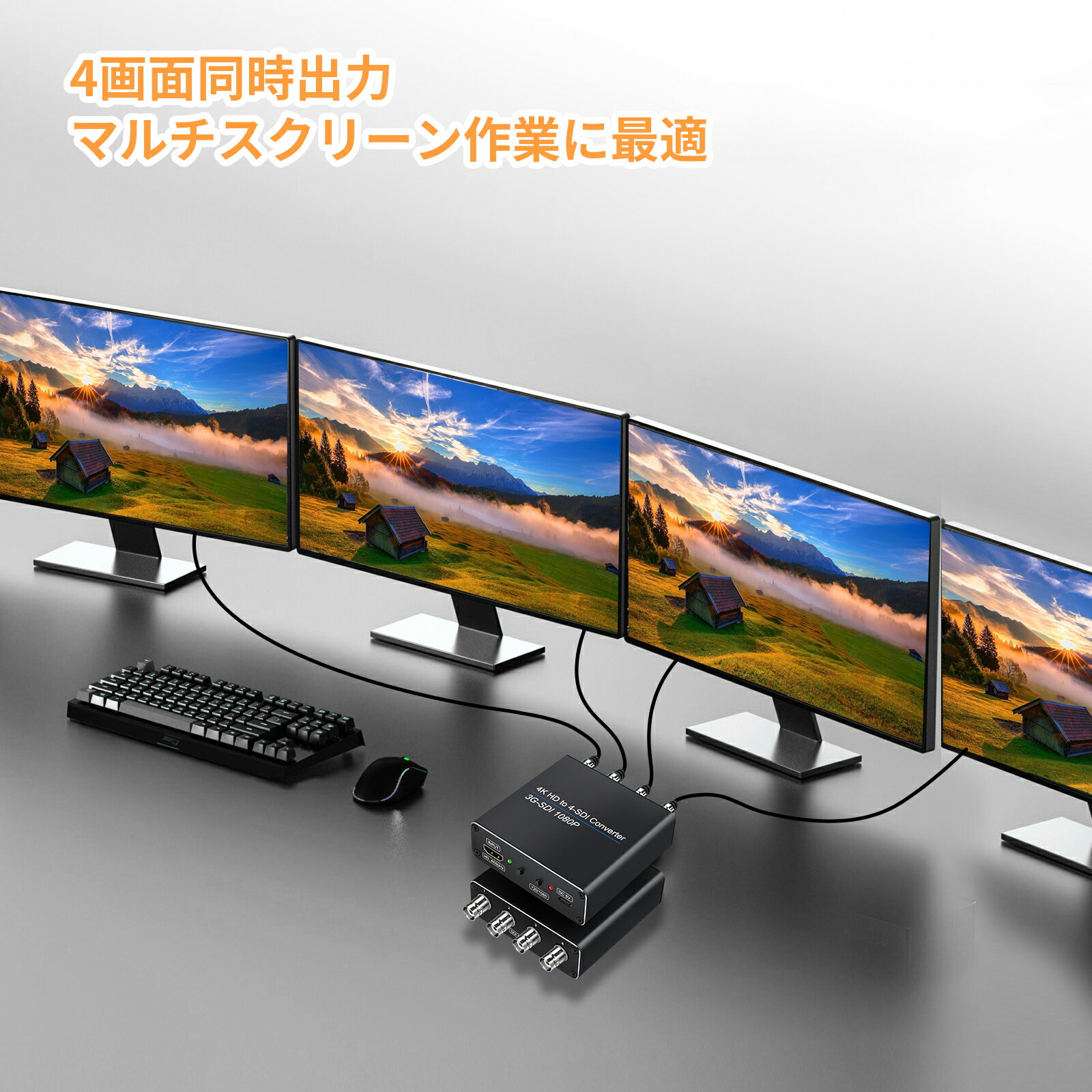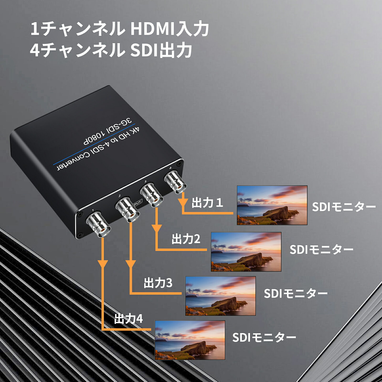 4K HDMI to SDIコンバーター 1×HDMI入力 4×SDI出力 4K HDMI解像度 3D-SDI/HD-SDI/SD-SDI信号自動識別