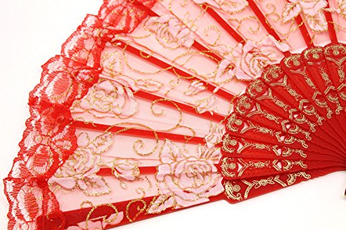 弁天屋本舗 全6色 練習用 ラメ入り 薔薇 レース 扇子 アバニコ バレエ ダンス リトモス キトリ スペイン 踊り レッスン 舞踊 (赤)