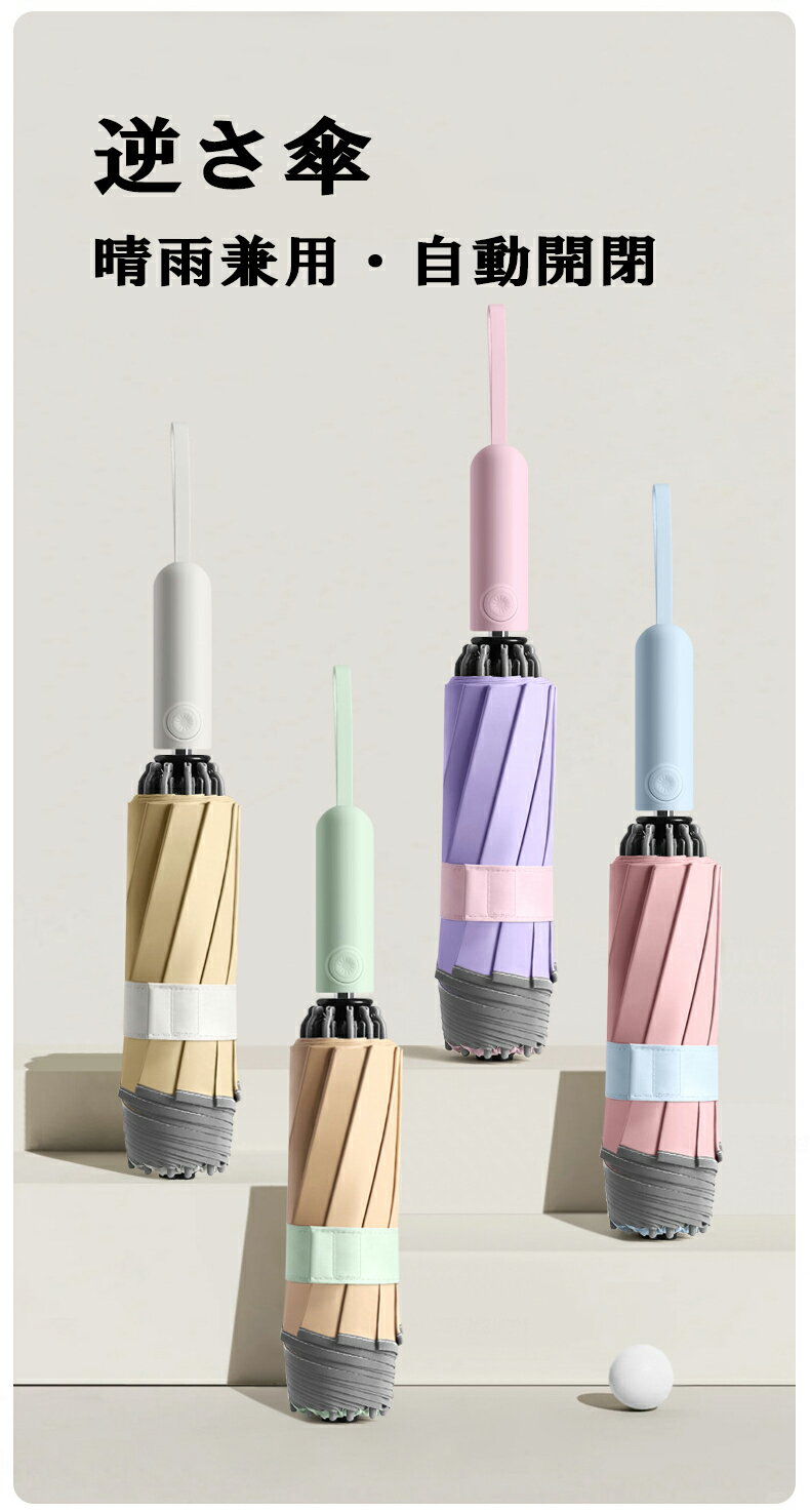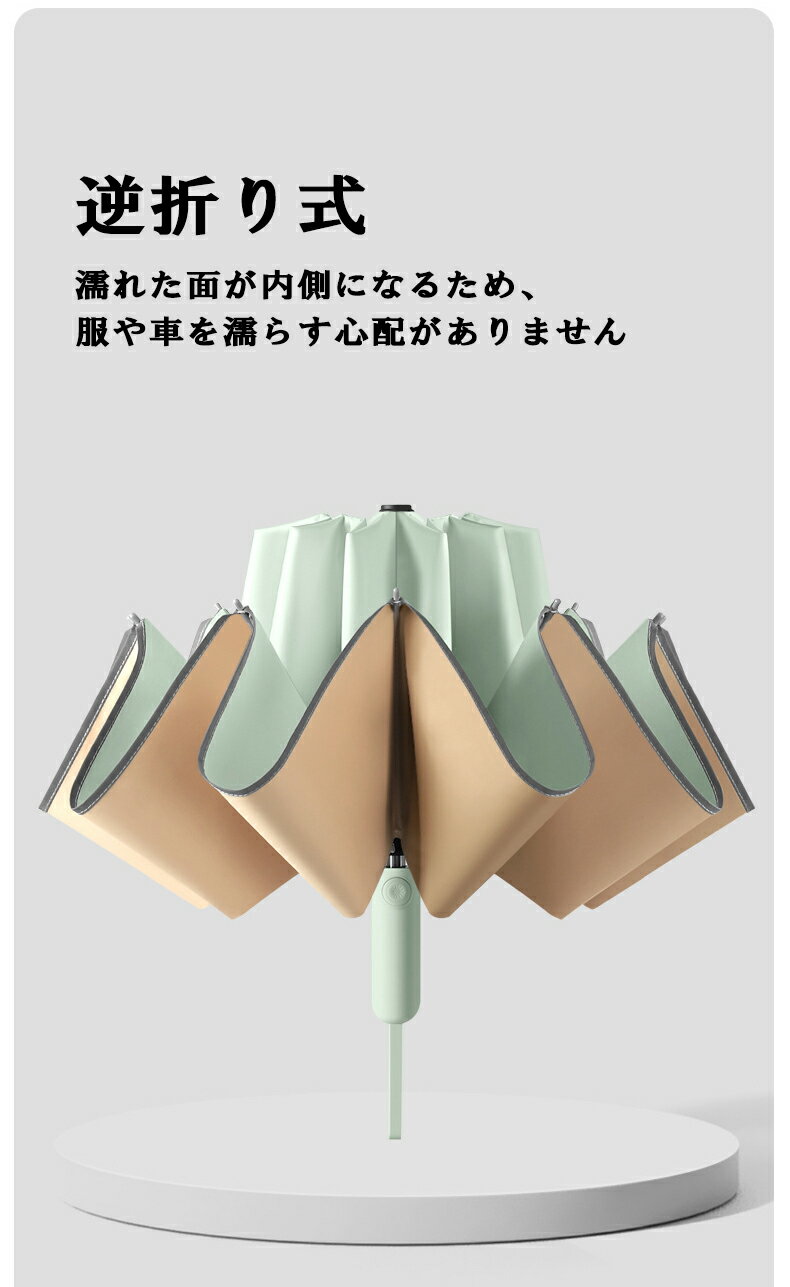 日傘 メンズ レディース ワンタッチ自動開閉 逆折り式傘 晴雨兼用 遮光 UVカット 携帯便利 折りたたみ傘 紫外線対策 逆さ傘 雨傘 撥水 10本骨 遮熱 大きい 逆折りタイプ おりたたみ傘 頑丈 耐風 かさ 反射テープ 梅雨対策 コンパクト デザインと機能を重ね備え、ビジネスにもデイリーにも活躍してくれる折畳傘です。 【ワンタッチ自動開閉傘】片手でカチッとボタンを押すだけで自動開閉できます。スマートに片手でオープンできる便利な逆転傘なので、傘をさす手間を煩わせません。手荷物が多いとき、車やバスの乗り降りのときなどに便利な折りたたみ傘です。【濡れない逆折り式傘】傘を閉じると濡れた面が内側になるため、水滴の飛び散りが少ない逆折り式の折りたたみ傘です。濡れた面が内側になっ逆折り式のため、傘についた水滴が自分や周りの人を濡らす心配がありません。車やタクシーに乗っても座席がびしょびしょにならず、傘をしまう時も手を濡らさずスマートに折り畳むことができます。【UVカット&完全遮光】高密度の傘布を採用し、優れた断熱性。遮光率100%効果・UVカット率99.9%、UPF50+を実現し、日差しからお肌を守ります。 涼しく過ごすための遮熱性も優れているため、暑い夏の熱中症対策にも。【反射テープ付き】夜道でも反射テープ付き、後方から近づく車のライトに反射して自分の位置を知らせるので、日暮れ時と夜道の交通セーフにも役立ちます。通勤や通学等に最高、夜残業の多いサラリーマンや夜に出かける方にもおすすめです。【高強度10本骨折りたたみ傘】柔軟性と強度を併せ持つ10本親骨を採用し、頑丈で風に強い設計になっています。超強靭な骨組みで強い風でも簡単に折れることはありません。傘骨は放射状で美しく、ファッショナブルです。 柔らかくて丈夫なカーボンファイバーを採用し、軽量かつ強度と耐久性に優れ、デザインと機能を重ね備え、ビジネスにもデイリーにも活躍してくれる折畳傘です。 5