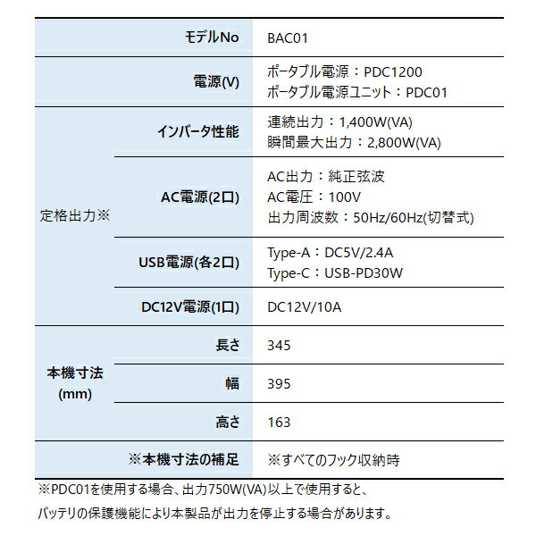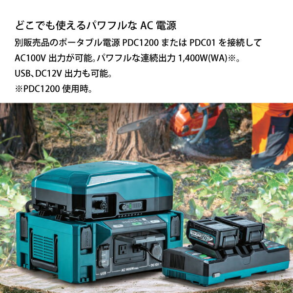マキタ(makita) DCACインバータ 本体のみ[BAC01]▼どこでもAC100V電源が使える 災害時や電源の取りづらい現場に便利(ポータブル電源別売)▼どこでも使えるパワフルなAC電源別販売品のポータブル電源PDC1200またはPDC01を接続してAC100V出力が可能。パワフルな連続出力1,400W(WA)※。USB、DC12V出力も可能。※PDC1200使用時。・災害時のスマホやバッテリの充電に・電源の取りづらい現場の照明に・屋外作業のバッテリ充電に▼PDC1200・PDC01を接続して使用PDC1200は大容量1,200Whで長時間作業が可能。PDC01は汎用的な18Vバッテリを使用可能。▼豊富な出力端子を搭載AC出力端子(2口)、USB出力端子(Type-A・C各2口)、DC12V出力端子(1口)の3電源に対応。▼運びやすいハンドル付側面部2ヶ所に配置。未使用時は折り畳み可能。▼別販売品のマックパックと連結できる上下どちらにも連結可能。さらに、トローリやカートにも連結可能で、優れた可搬性。 ■仕様【電源(V)】ポータブル電源:PDC1200ポータブル電源ユニット:PDC01【定格出力】・インバータ性能 連続出力:1,400W(VA) 瞬間最大出力:2,800W(VA) ※1 PDC01を使用する場合、出力750W(VA)以上で使用すると、バッテリの保護機能により本製品が出力を停止する場合があります。・AC電源(2口) AC出力:純正弦波 AC電圧:100V 出力周波数:50Hz/60Hz(切替式)・USB電源(各2口) Type-A/:DC5V/2.4A Type-C:USB-PD30W・DC12V電源(1口):DC12V/10A【本製品寸法】長さ345×幅395×高さ163mm(すべてのフック収納時)【動作時間】PDC1200:約56分(1,000W出力時)PDC01:約10分(750W出力時、BL1860B×2本装着)【質量】7.3kg【kk9n0d18p】[ 伐木 伐採 林業 農林 マキタ MAKITA パワーツール 発電機 発電器 災害 防災 停電 電源 インバーター ]2023/05/10 適格請求書発行事業者