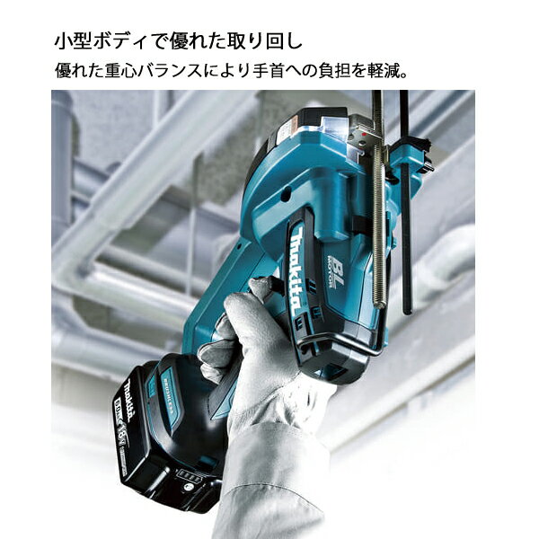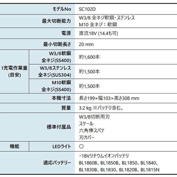 マキタ(makita) 18V/14.4V 充電式全ネジカッタ 本体のみ[SC102DZK]▼コンパクト&豊富な作業量ステンレス全ネジW3/8(3分)対応別売品で軟鋼:W5/16用(2分5里)にも対応■特長●小型ボディで優れた取り回し優れた重心バランスにより手首への負担を軽減。●床面でも安定切断●優れた刃物寿命●可動刃全開位置停止機構トリガを引き続けても、可動刃は全開位置で停止●最小切断長さ20mm薄型LED照明を設置する際に便利 ■仕様【モデルNo】SC102D【最大切断能力】 W3/8mm 全ネジ軟鋼・ステンレス W5/16:軟鋼※別販売品(品番:A-67913)にて可能 M10全ネジ:軟鋼※別販売品(品番:A-66949)にて可能【電源】直流18V(14.4も可)【最小切断長さ】20mm【1充電作業量(目安) 】 W3/8軟鋼全ネジ(SS400):約1,600本 W3/8ステンレス全ネジ(SUS304):約1,500本 M10軟鋼全ネジ(SS400):約1,500本【本機寸法】長さ199×幅103×高さ308mm【質量】3.2kg※バッテリ含む。【標準付属品】 W3/8切断用刃 スケール 六角棒スパナ 刃カバー【機能】LEDライト :〇【適応バッテリー】●18VリチウムイオンバッテリBL1860B、BL1850B、BL1850、BL1840、BL1830B、BL1830、BL1820B、BL1815N※国内仕様のメーカー純正品です。並行輸入品・互換品・再生品ではございません。※安全に商品をご使用いただくために、マキタ製充電式製品には、マキタ純正のバッテリー・充電器をご使用いただきますようお願いします。なお、当店では模倣品、互換品のバッテリー・電池パック、リサイクル修理されたバッテリー・電池パックのご使用に起因する事故・故障につきましては、一切の責任を負いかねますのでなにとぞご了承ください。【kk9n0d18p】[ マキタ MAKITA 正規販売店 DIY コンパクト 小型 電動工具 ツール 工具 大工 日曜大工 コードレス パワーツール 充電式 バッテリー式 バッテリ式 充電式全ネジカッタ バッテリー式全ネジカッタ バッテリー全ネジカッタ LED ライト付き ]2025/05/07