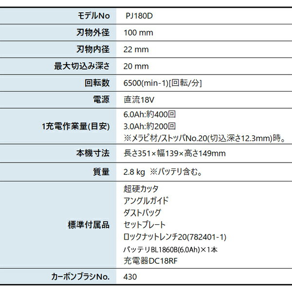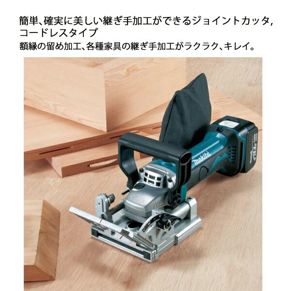 マキタ(makita) 18V 充電式ジョイントカッタ バッテリー ・充電器付き[PJ180DRG]▼ビスケット(ブナ圧縮材)により、額縁の留め加工、各種家具の継ぎ手加工がラクラク、キレイ●簡単、確実に美しい継ぎ手加工ができるジョイントカッタ,コードレスタイプ額縁の留め加工、各種家具の継ぎ手加工がラクラク、キレイ。●アングルガイドで正確な位置調整アングルガイドで溝の加工位を素早く、正確に調整。ツマミ式だから微調整も簡単。●ワンタッチ切込み深さ調整ストッパを回すだけで6段階調整可能。(3段階はビスケットNo.に連動)●フェンスで素早く角度調整フェンスは0゜〜90°まで無段階調整。0゜、45゜、90°はストッパ付でサッと調整できます。 ■仕様【モデルNo】PJ180D【刃物外径】100mm【刃物内径】22mm【最大切込み深さ】20mm【回転数】6,500min-1[回転/分]【電源】直流18V【充電時間】バッテリBL1860B(1本)、充電器DC18RF 実用充電:約27分 フル充電:約40分【1充電作業量(目安)】 6.0Ah:約400回 3.0Ah:約200回※メラピ材/ストッパNo.20(切込深さ12.3mm)時。【本機寸法】長さ:351×幅:139×高さ:149mm【質量】2.8kg※バッテリ含む。【標準付属品】 超硬カッタ アングルガイド ダストバッグ セットプレート ロックナットレンチ20(782401-1) プラスチックケース バッテリBL1860B(6.0Ah)×1本 充電器DC18RF プラスチックケース【カーボンブラシNo.】430届出事業者名:株式会社マキタPSマークの種類:PSE※国内仕様のメーカー純正品です。並行輸入品・互換品・再生品ではございません。※安全に商品をご使用いただくために、マキタ製充電式製品には、マキタ純正のバッテリー・充電器をご使用いただきますようお願いします。なお、当店では模倣品、互換品のバッテリー・電池パック、リサイクル修理されたバッテリー・電池パックのご使用に起因する事故・故障につきましては、一切の責任を負いかねますのでなにとぞご了承ください。【kk9n0d18p】[ マキタ MAKITA 正規販売店 DIY 充電式 バッテリー式 電動 電動工具 工事 作業 ツール 工具 大工 日曜大工 コードレス パワーツール バッテリ式 ]2025/05/14
