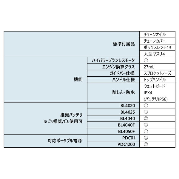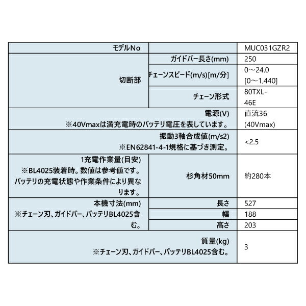 マキタ(makita) 40Vmax 充電式チェンソー 25cm 80TXL-46E 本体のみ[MUC031GZR2]▼27mLクラスで、最軽量※&最速切断※手首の負担減、軽快な取回し。80TXL仕様※2025年7月現在、メーカー調べ。■特長●27mLエンジン式クラスで軽快作業進化した最適バランスと納得の切断性能で、枝打ち作業を快適・スピーディにこなします。●手元の負担軽減&軽快な取回し最適バランス設計手元とバッテリの距離が近く、抜群の操作感。●縦向き、横向きの切り返し時のストレスを軽減クラス最軽量3.0kg(ガイドバー250・300mm装着時)※。作業時の負担を軽減。※27mLクラスプロ向け同出力帯チェンソーにおいて。2025年7月現在当メーカー調べ。ガイドバー200mm装着時は2.9kg●クラス最速※の切断能率(小型・軽量)な高回転アウタロータハイパワーブラシレスモータ+ダイレクトドライブにより、チェーンスピードは24.0m/秒(1,440m/分)とスピーディな切断を実現。※27mLクラスプロ向け同出力帯チェンソーにおいて。2025年7月現在メーカー調べ。充電状態や樹木の種類、刃物の切れ味などにより異なります。●エンジン式同等の優れた加速性能トリガオンから素早く全速回転。オン/オフを繰り返す、細かい枝払いを軽快に行えます。●「リトリガ」不要で素早く再起動(ロック時)※過負荷によりロックしても、負荷を取り除けば、トリガを引き直さずに再起動。トリガを引いたまま作業を再開できます。※ロックの状態によっては再起動できない事があります。●新型スイッチ採用厚手のグローブを装着しても押しやすい優れた操作性。製品状態の把握が容易なLEDお知らせランプ付。●クイック着脱フックカラビナ等に片手で取付け・取外し可能。フックは、折りたたみ式で、使用時以外は収納可能。●高い防水性能雨の中でも運転可能な、防滴・防じん「ウェットガード」& 防水保護等級「IPX4」を採用。※本製品は(充電器除く)、雨の中での使用等に耐えうる製品仕様となっていますが、故障しないことを保証するものではありません(マキタ基準)。水や粉じんによって故障しないことを保証するものではありません。バッテリを装着した場合は、本体側の保護等級に準じます。●薄刃 80TXL仕様ゲージ厚1.1mmの薄刃仕様。切断抵抗を大幅低減。鋭い喰いつきで快速切断。竹切断にも対応。ピッチ:0.325”。スプロケットノーズバー先端部のスプロケット(歯車)でチェーンの回転抵抗を減らし、パワーを最大限に伝達。●高所の枝払い作業に●入り組んだ枝のせん定に■その他特長●脱落防止ナット●「収納式」大型オイルタンクキャップ●オイルタンク残量窓●金属製チェーンキャッチャ●トリガ変速 ■仕様【モデルNo】MUC031GZR2【切断部】 ガイドバー長さ:250mm チェーンスピード:0〜24.0m/s(0〜1,440m/分)【チェーンタイプ】80TXL【コマ数(バーの長さ)】46E(25 cm)【適合ソーチェーン品番】80TXL046E【電源】直流36V(40Vmax)※40Vmaxは満充電時のバッテリ電圧を表しています。【振動3軸合成値】<2.5m/s2※EN62841-4-1規格に基づき測定。【1充電作業量(目安)】杉角材50mm:約280本※BL4025装着時。数値は参考値です。バッテリの充電状態や作業条件により異なります。【本機寸法】長さ527×幅188×高さ203mm※チェーン刃、ガイドバー、バッテリBL4025含む。【質量】3kg※チェーン刃、ガイドバー、バッテリBL4025含む。【標準付属品】 チェーンオイル チェーンカバー ボックスレンチ13 丸型ヤスリ4【機能】 ハイパワーブラシレスモータ:○ エンジン換算クラス:27mL ガイドバー仕様:スプロケットノーズ ハンドル仕様:トップハンドル 防じん・防水:ウェットガードIPX4(バッテリIP56)【対応ポータブル電源】PDC01、PDC1200【適応バッテリー】●40Vmaxリチウムイオンバッテリ BL4020 〇 BL4025 ◎ BL4040 ◎ BL4040F ◎ BL4050F 〇※◎:推奨/〇:使用可※国内仕様のメーカー純正品です。並行輸入品・互換品・再生品ではございません。※安全に商品をご使用いただくために、マキタ製充電式製品には、マキタ純正のバッテリー・充電器をご使用いただきますようお願いします。なお、当店では模倣品、互換品のバッテリー・電池パック、リサイクル修理されたバッテリー・電池パックのご使用に起因する事故・故障につきましては、一切の責任を負いかねますのでなにとぞご了承ください。【kk9n0d18p】[ マキタ MAKITA 正規販売店 パワーツール 林業 チェンソー チェーンソー 充電式 バッテリー式 充電式チェンソー バッテリー式チェンソー 充電式チェーンソー バッテリー式チェーンソー バッテリーチェンソー バッテリーチェーンソー 切断 バッテリ・充電器別売 電動 チェーンソー 軽量 枝払い せん定 剪定 防水 防滴 防じん 電動チェンソー 電動チェーンソー ]2025/10/08