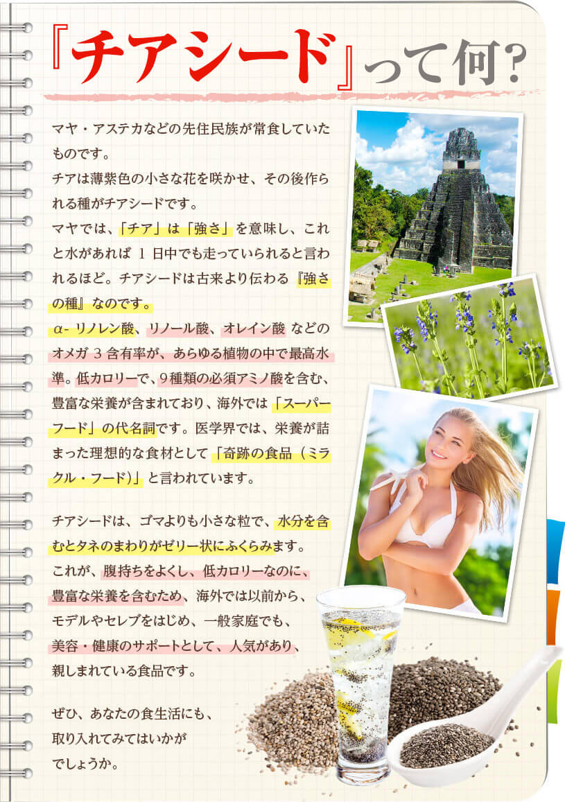 サイズ違いはこちら 200g メール便 200g 600g メール便 600g 900g メール便 900g※在庫についての注意事項 当商品は自社販売と在庫を共有しております。 在庫更新のタイミングによっては在庫切れとなってしまい、やむを得ず注文をキャンセルさせて頂く可能性がございます。予めご了承下さい。 ※メール便にて全国送料無料でお届け! ⇒こちらの商品は、メール便専用商品です。(宅配便専用商品もあります。) 代金引換決済、配送日時の指定はできません。お急ぎの方は【メール便送料無料】の表示のない商品(宅配便での配送)でご購入ください。 ★ 計量スプーンもご一緒にいかがですか? ★ ニチガのサプリメント・食品・エコ洗剤の計量にお使い頂けるスプーンも販売しております。 スプーンのページはこちらです。 名 称 チアシード(CHIA SEEDS)【国内殺菌品】 原材料名 チアの種子 内容量 900g 賞味期限 別途商品に記載 保存方法 高温多湿及び直射日光をさけて保管ください。 原産国 ボリビア、エクアドル、アルゼンチン、メキシコ、パラグアイ 加工者 日本ガーリック株式会社群馬県高崎市八幡原町1008-3 形 状 − 使用上の注意 ○まれにチア由来の葉や茎の部分などが入っている場合がありますが、品質に問題ございません。 ○天産物を原料とした商品であり、着色料、香料を使用いたしておりません。そのため製造ロットにより風味が異なる場合がございます。予めご了承ください。 ○開封後は湿気に注意してチャックをしっかり閉めて保存し、早めにお召し上がりください。 ○原材料名を御確認の上、食品アレルギーのある方は召し上がらないでください。 ○薬を服用中あるいは通院中の方は、お医者様にご相談の上、お召し上がりください。 ○乳幼児の手の届かない場所で保管してください。 ○食生活は主食・主菜・副菜を基本に、栄養バランスを大切にしてください。 ○合わない場合は、利用を中止し医師に相談してください。 1日の摂取量の目安 1日10g程度(大さじ1杯程度)を目安にお召し上がりください。 アレルギー情報 本品に含まれるアレルギー物質(28品目中):無 ※本製品の製造ラインでは、大豆、小麦、乳、豚肉、バナナ、リンゴ、ゼラチン、アーモンドを含む製品を製造しています。 残留農薬 残留農薬検査済 日本国内で実施した検査検出されず(不検出)です。 殺菌方法 ※殺菌工程:135度の蒸気にて8秒間噴霧蒸気殺菌、その後成分破壊がないか検査済み ※化学薬品は一切使用しておりません。残留農薬検査済 区 分 日本製・食品 ■【栄養成分表示(製品100gあたり)】 エネルギー 534kcal たんぱく質 18.5g 脂質 34.9g 炭水化物 36.4g -糖質 5.2g -食物繊維 31.2g 食塩相当量 0.0g α−リノレン酸 63.10% リノール酸 20.13% オレイン酸 7.47% 原材料名(加工地) 原 料 原料産地 チアシード(日本) チアシード ボリビア、エクアドル、アルゼンチン、メキシコ、パラグアイ 【ご注意(免責)】 >> 必ずお読み下さい。 ●まれにチア由来の葉や茎の部分などが入っている場合がありますが、品質に問題ございません。 ●天産物を原料とした商品であり、着色料、香料を使用いたしておりません。そのため製造ロットにより風味が異なる場合がございます。予めご了承ください。 【チアシード(CHIA SEEDS)】 チアチードは、α-リノレン酸、リノール酸、オレイン酸などのオメガ3含有率が、あらゆる植物の中で最高水準。低カロリーで、9種類の全必須アミノ酸を含む、豊富な栄養が含まれており、海外では「スーパーフード」の代名詞です。医学界では理想的な食材として「奇跡の食品(ミラクル・フード)」と言われています。その他、コレステロール、アレルゲンのグルテンフリー。無味・無臭なので様々なお料理に応用でき、あなたの美容・健康をサポートします。