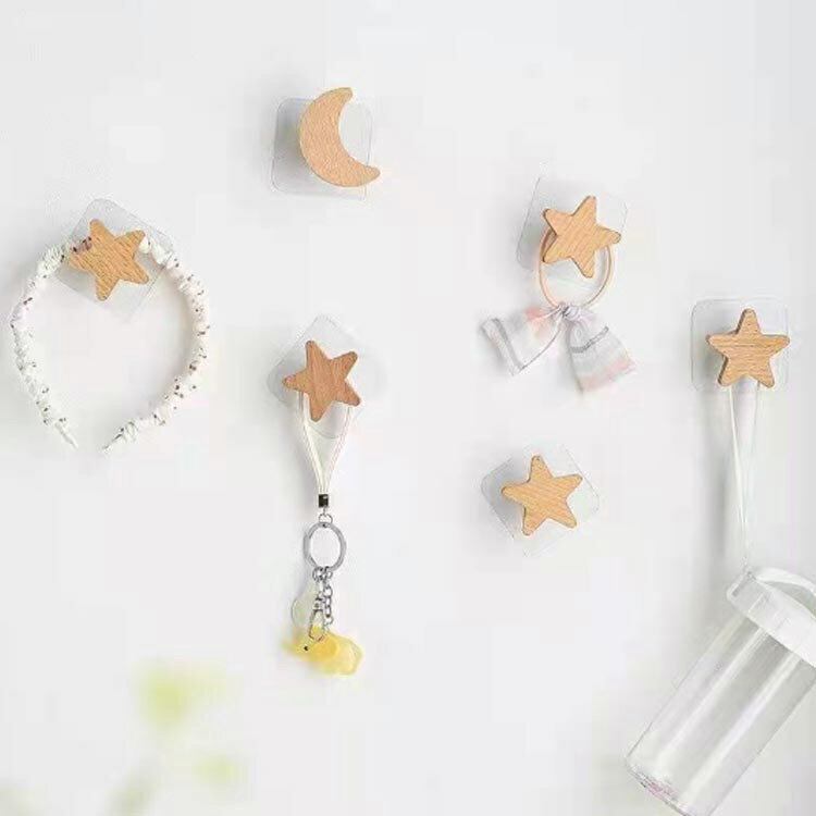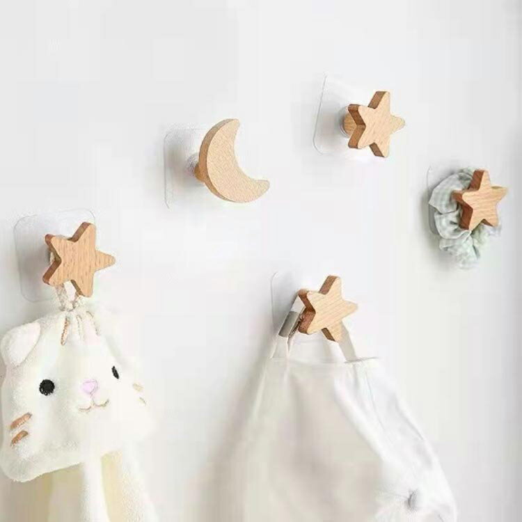 壁掛け 4個セット フック 洋服掛け 木 おしゃれ 粘着フック 雲 月 星 耐荷重5kg 木製 コートフック ウォールフック キッチン 北欧 見せる収納 帽子掛け インテリア 壁掛け オフィス用 子供部屋 フイルム 強力粘着 かわいい 壁 フック